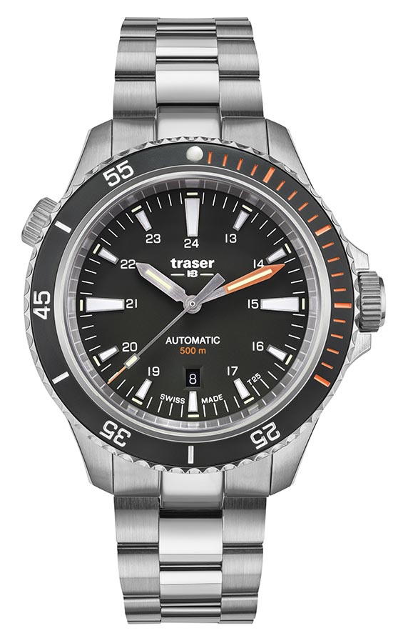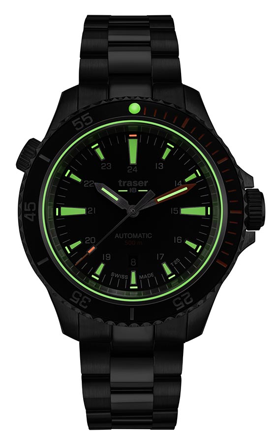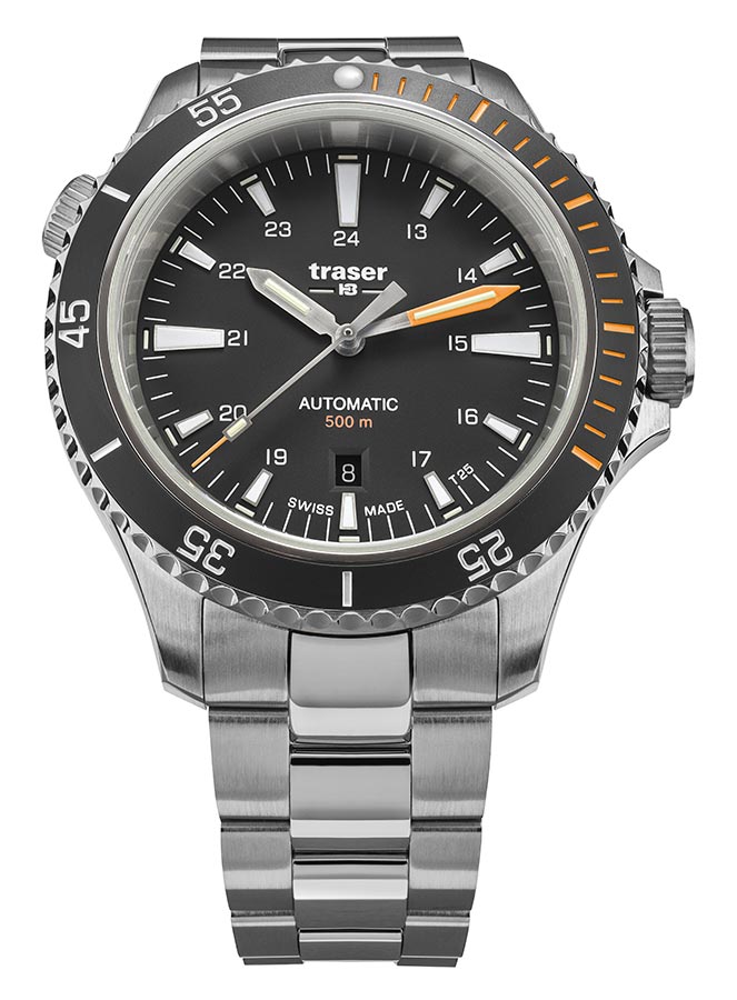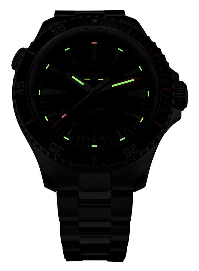 Nová edice profesionálních outdoorových diverských hodinek traser® je nyní k dispozici se švýcarským mechanickým Machinekem s automatickým samonatahovacím Machinekem! Pánské hodinky Traser P67 Diver Automatic Black T25 SET 110321 jsou dlouho očekávaným mechanickým nástupcem quartz modelu P67 SuperSub. Stejně jako jeho předchůdce splňuje přísné normy ISO 6425, které definují požadavky na hodinky pro profesionální potápění. Jeho působivé, 46 mm a do 500 metrů voděodolné pouzdro z vysoce kvalitní nerezové oceli je vybaveno heliovým ventilem a speciálně chráněnou korunkou. Ciferník je skvěle čitelný jak ve dne, tak v noci, stejně jako 500 metrů pod hladinou moře, za což vděčí nejen efektnímu designu, ale především inovativní technologii trigalight® , která poskytuje soběstačný zdroj světla. . Jedná se o ideální nabídku pro profesionální divere, všechny hledače a průzkumníky, jejichž nedostupnost jen více přitahuje sportovce a outdoorové nadšence. Hodinky jsou naprosto robustní, snadno ovladatelné, funkční, robustní a atraktivní i pro každodenní použití.