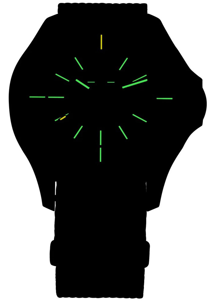 Na přední straně je safírové sklíčko odolné proti poškrábání, které chrání černý ciferník před poškozením. Ciferník v leteckém stylu s velkými ručičkami, indexy a datumovkou na 3. hodině je skvěle čitelný ve dne i v noci, za což vděčí nejen efektnímu designu, ale především inovativní technologii trigalight® , která poskytuje soběstačný zdroj světla.