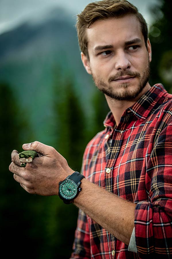 P68 Pathfinder je kombinací švýcarské přesnosti a užitečných funkcí. Srdcem hodinek je spolehlivý a přesný quartz Machineek na baterie. Zodpovídá za přesné měření času s uvedením data a druhého časového pásma GMT. Nejdůležitější funkcí časomíry je kompas, který bude viditelný ve dne, při západu slunce i v noci. Indexy a geografické směry jsou vyplněny SupeLuminova® , zatímco ostatní indexy jsou obdélníkové trubice s tritiem, které jsou také zapuštěny na ručičkách. Pouzdro je vyrobeno z nerezové oceli o průměru 46 mm a má černý PVD povlak. Zelený textilní řemínek odkazuje k barvě hodinek.
