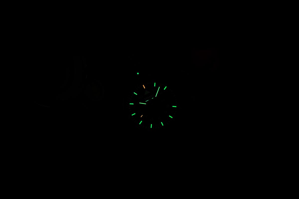 Charakteristické Black Stealth ohyby, žádné standardní očka pouzdra, ke kterému je řemínek připevněn, v tomto případě se jedná o materiál NATO v zelené barvě. Vyčnívající část pouzdra na 3. hodině chrání šroubovací korunku před zlomením nebo zachycením. Obousměrně otočný keramický kroužek má speciální jazýčky, které usnadňují manipulaci. Vysokou třídu vodotěsnosti 20 bar/atm zajišťuje šroubovací korunka a zadní pouzdro ve spodní části hodinek. To dokonce umožňuje hluboké potápění.