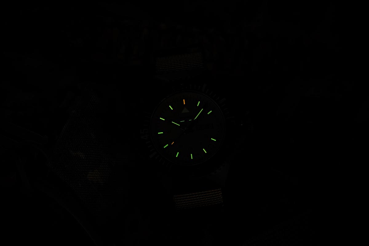 Charakteristické Black Stealth ohyby, žádné standardní očka pouzdra, ke kterému je řemínek připevněn, v tomto případě se jedná o materiál NATO v béžové, pískové barvě. Vyčnívající část pouzdra na 3. hodině chrání šroubovací korunku před zlomením nebo zachycením. Obousměrně otočný keramický kroužek má speciální jazýčky, které usnadňují manipulaci. Vysokou třídu vodotěsnosti 20 bar/atm zajišťuje šroubovací korunka a zadní pouzdro ve spodní části hodinek. To dokonce umožňuje hluboké potápění.