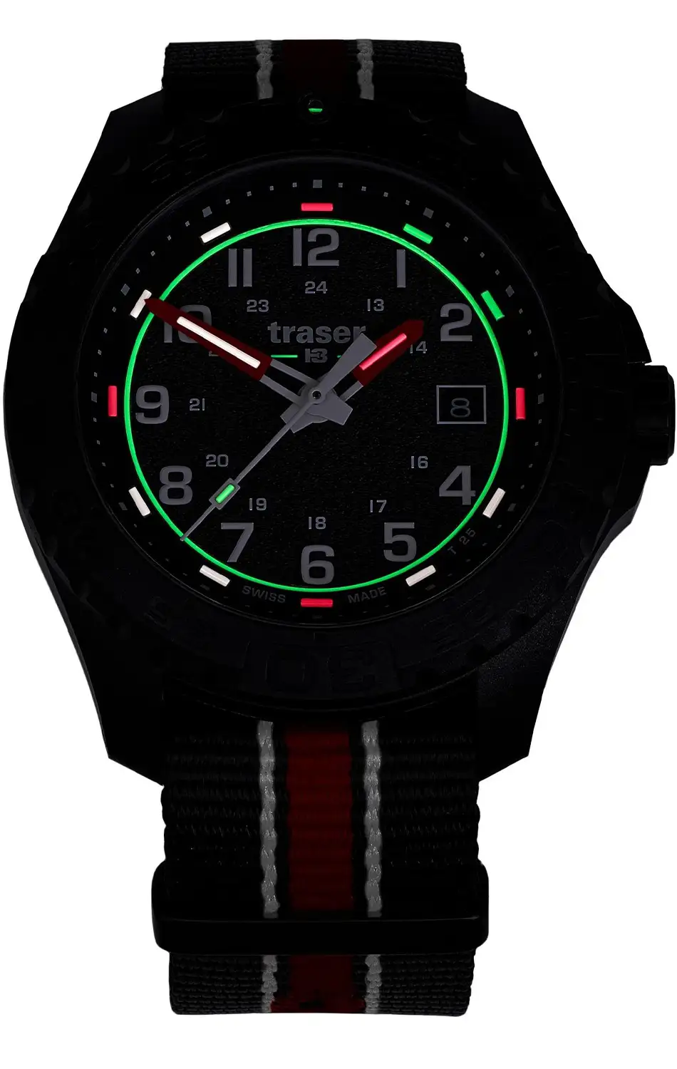 Konstrukce hodinek Traser P96 je založena na pouzdře vyrobeném z polymeru GFRP, tedy materiálu vyztuženého skelnými vlákny, který kombinuje vysokou mechanickou odolnost s nízkou hmotností. Při průměru 44 mm zůstávají hodinky překvapivě lehké, s hmotností přibližně 70 gramů, což má zásadní význam při dlouhodobém nošení. Vodotěsnost do 200 metrů, šroubovací dýnko a safírové sklo s vnitřní antireflexní vrstvou zajišťují bezpečné používání v dešti, blátě, vodě i při intenzivním světle. Prezentovaný model je dodáván na řemínku NATO, lehkém a pružném, zapínaném na přezku. Celek doplňuje švýcarský strojek Ronda 515, optimalizovaný pro požadavky značky Traser, s praktickým datem a centrální sekundovou ručkou.