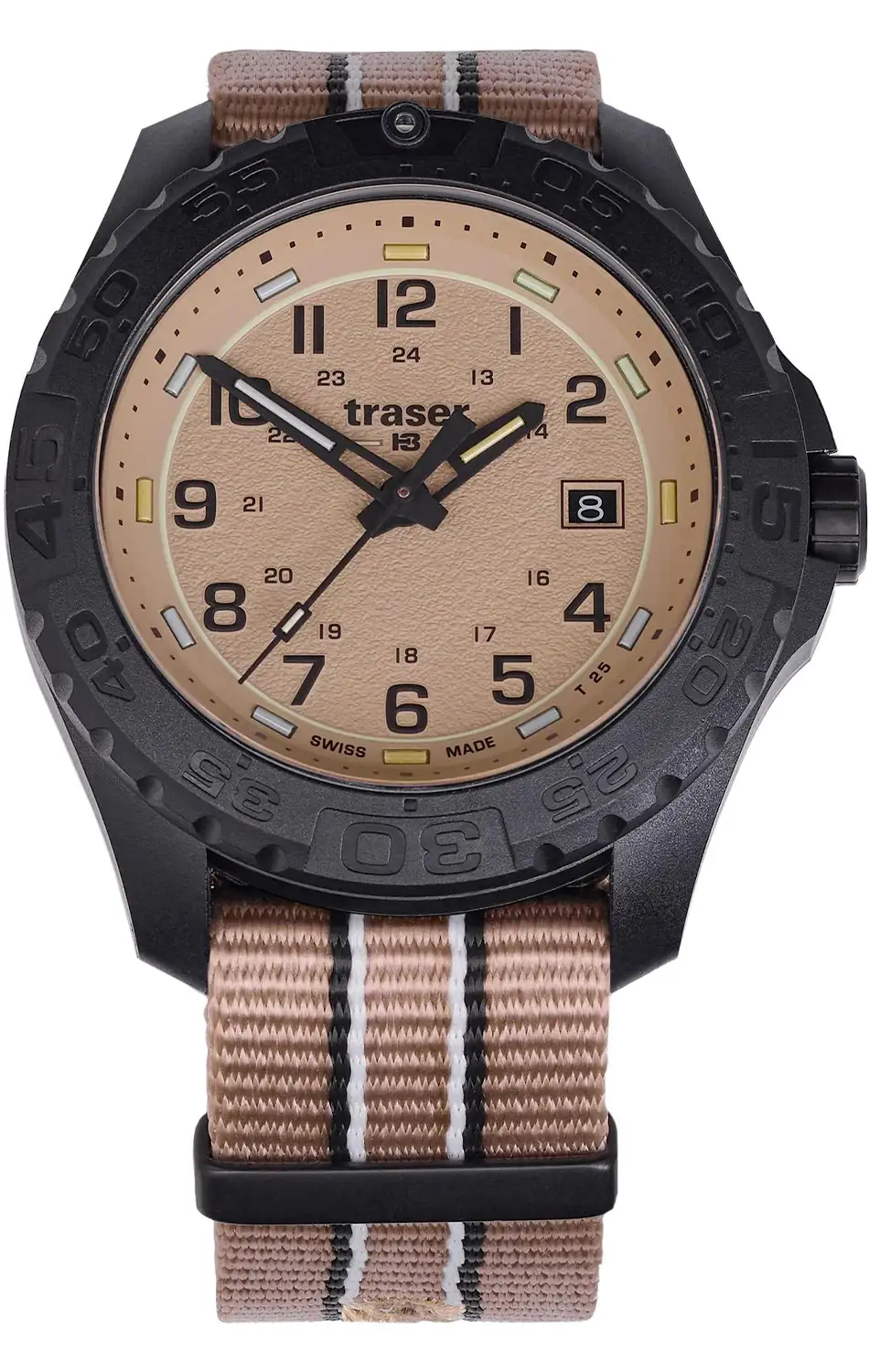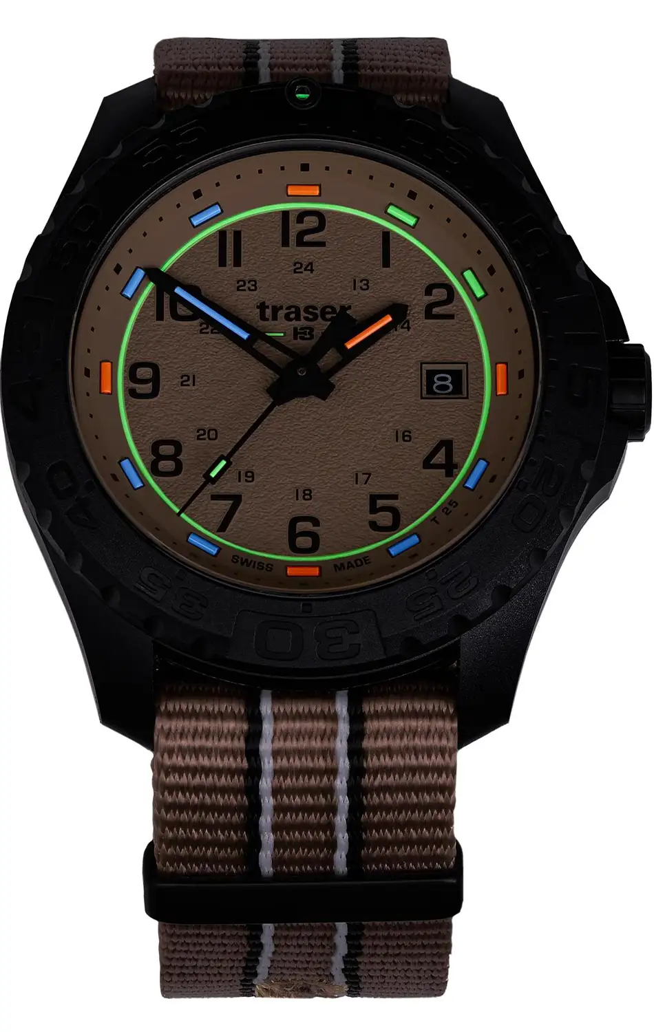 Čitelnost taktického časoměru Traser P96 není dílem náhody. Drsná textura ciferníku omezuje odlesky světla, matné černé pouzdro eliminuje reflexy a výrazné arabské číslice, kontrastní indexy a skeletované ručky vytvářejí přehledné, logické uspořádání. Dvojitá stupnice 12 a 24 hodin zdůrazňuje vojenský původ modelu a usnadňuje orientaci v čase při terénních operacích. Jsou to hodinky, které se nesnaží imponovat formou, ale důsledně plní svou funkci. Pokud hledáš nástroj, který funguje vždy stejně spolehlivě, Traser P96 OdP Color Sand jednoduše odvádí svou práci – a právě proto patří na správné zápěstí.