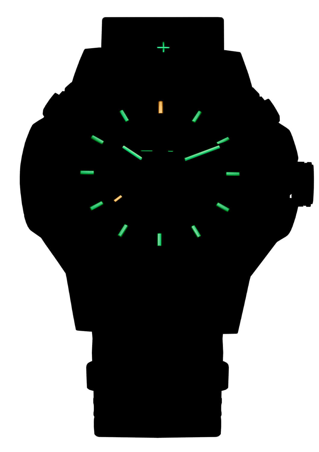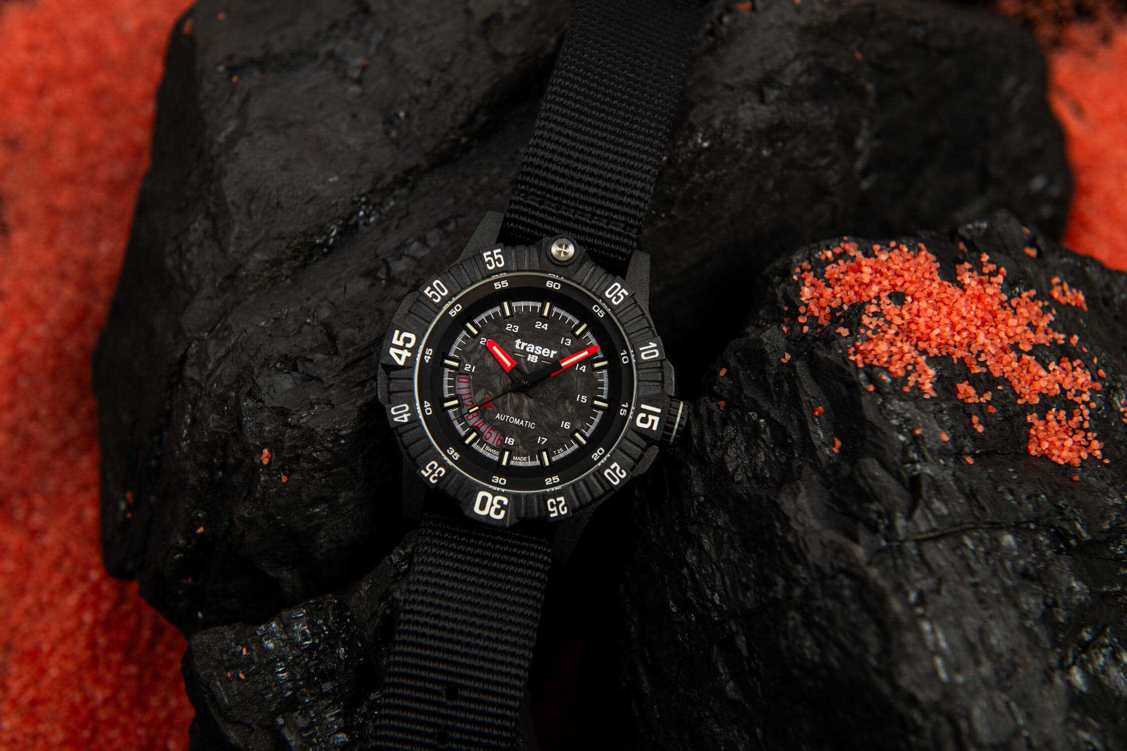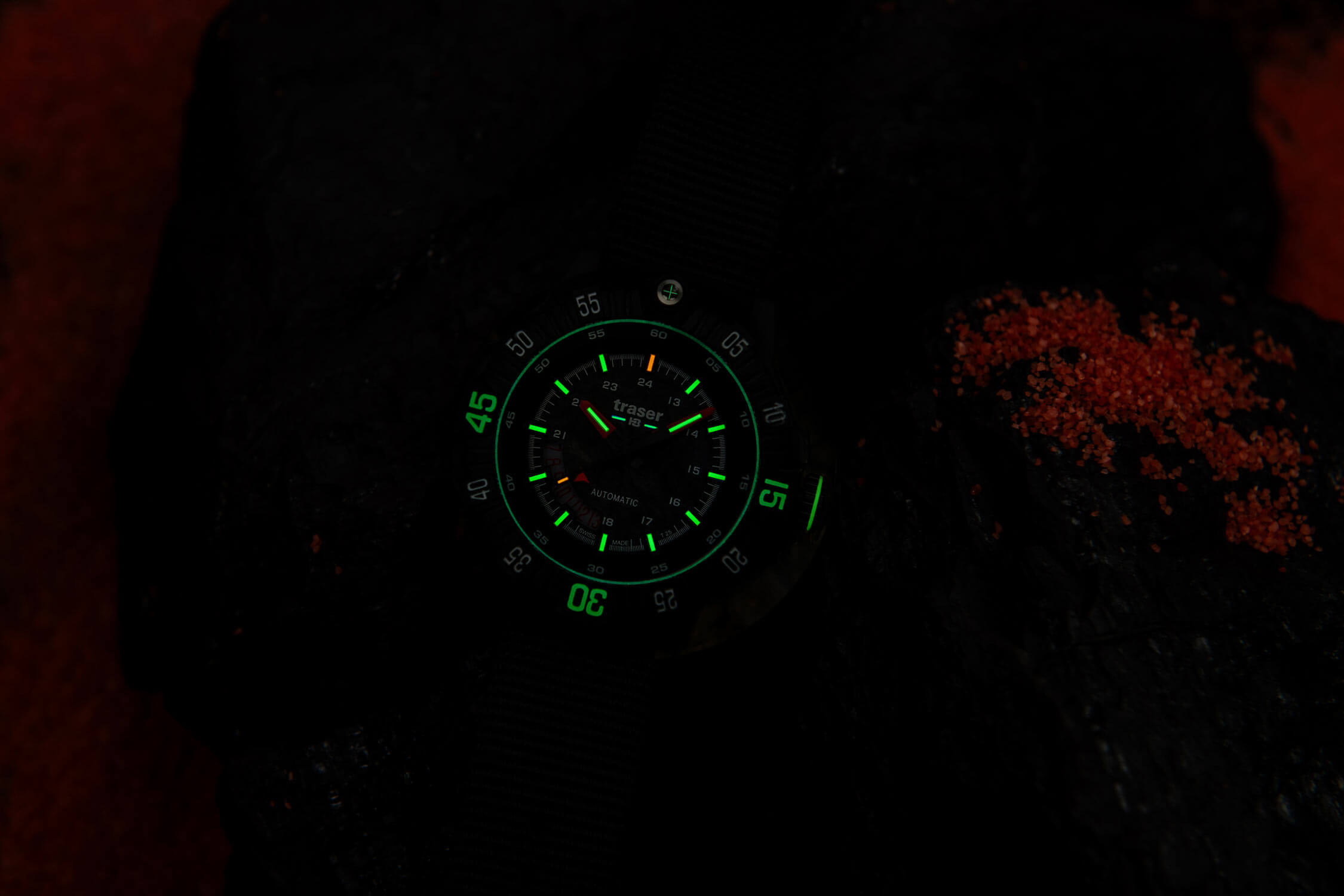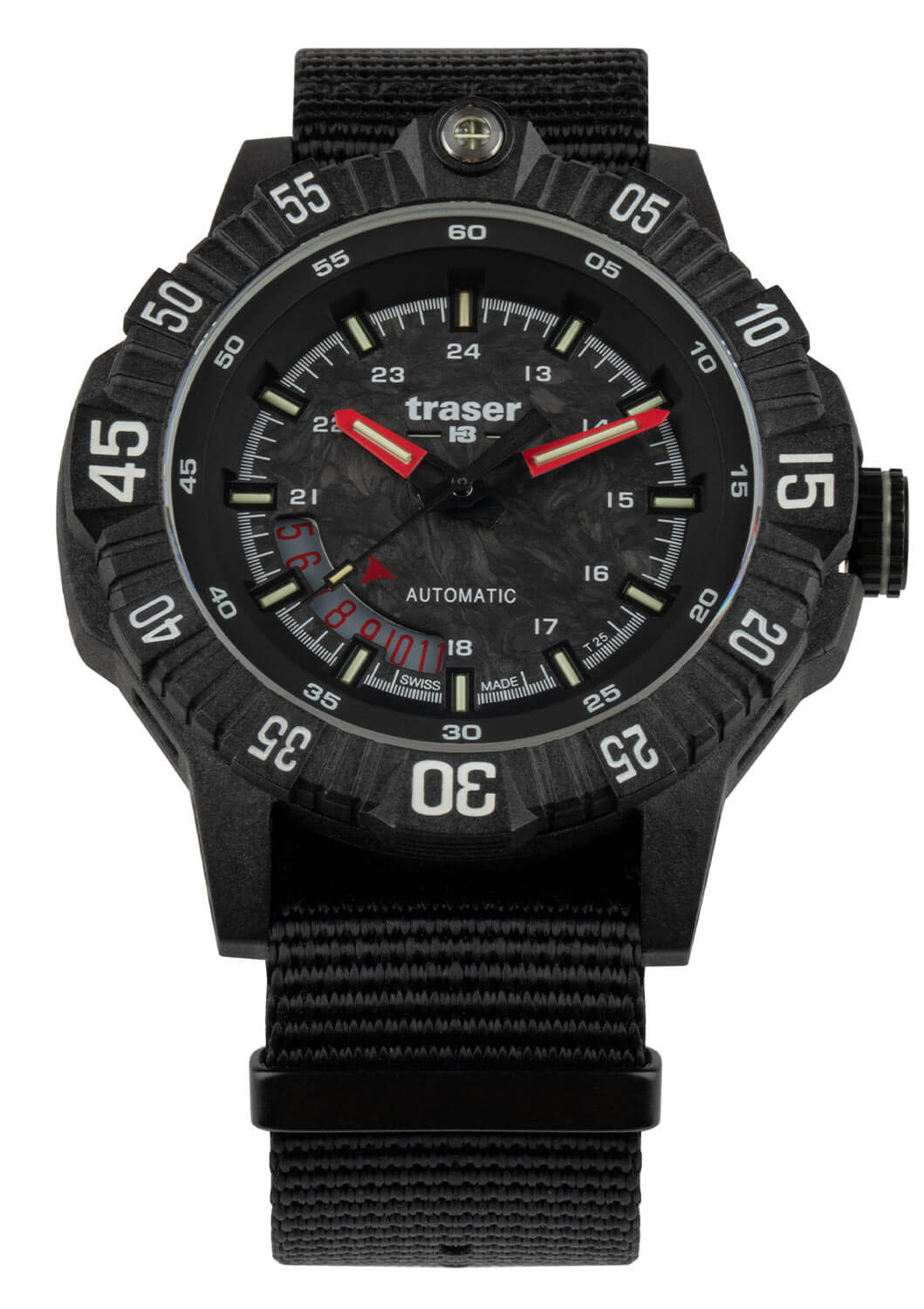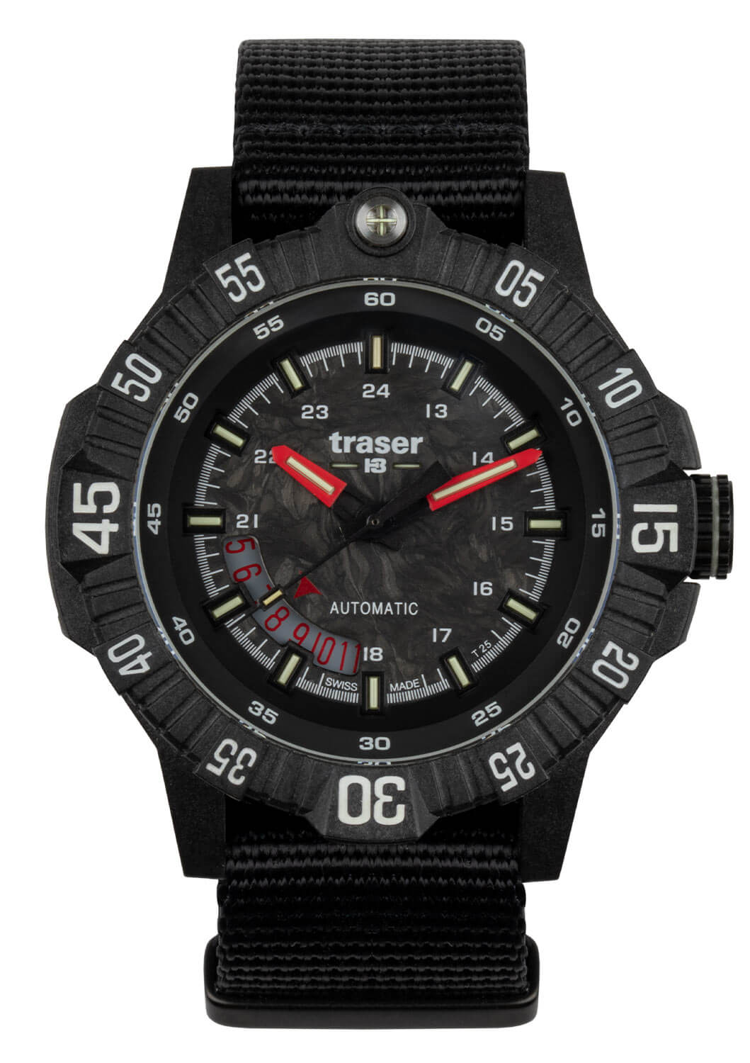Taktické hodinky Traser 111355 se vyznačují černým, vícevrstvým ciferníkem z karbonu, jehož struktura dodává hloubku a jedinečný styl. To, co opravdu upoutá pozornost, je jedinečný jas technologie trigalight® – plynové trubičky zajišťují jemné a dlouhotrvající podsvícení, díky kterému je čas čitelný i v úplné tmě. Dále jsou indexy 15, 30 a 45 na odolné karbonové lunetě pokryty vrstvou Super-LumiNova®, která zvyšuje jejich viditelnost a dodává hodinkám moderní charakter. Dokonce i těsnění kolem safírového sklíčka je podsvícené, což nejen zlepšuje funkčnost, ale také dodává hodinkám nádech futuristického stylu. Praktický datumový ukazatel umístěný u osmé hodiny byl navržen s ohledem na pohodlí – umožňuje rychlé a intuitivní zjištění aktuálního dne v měsíci.