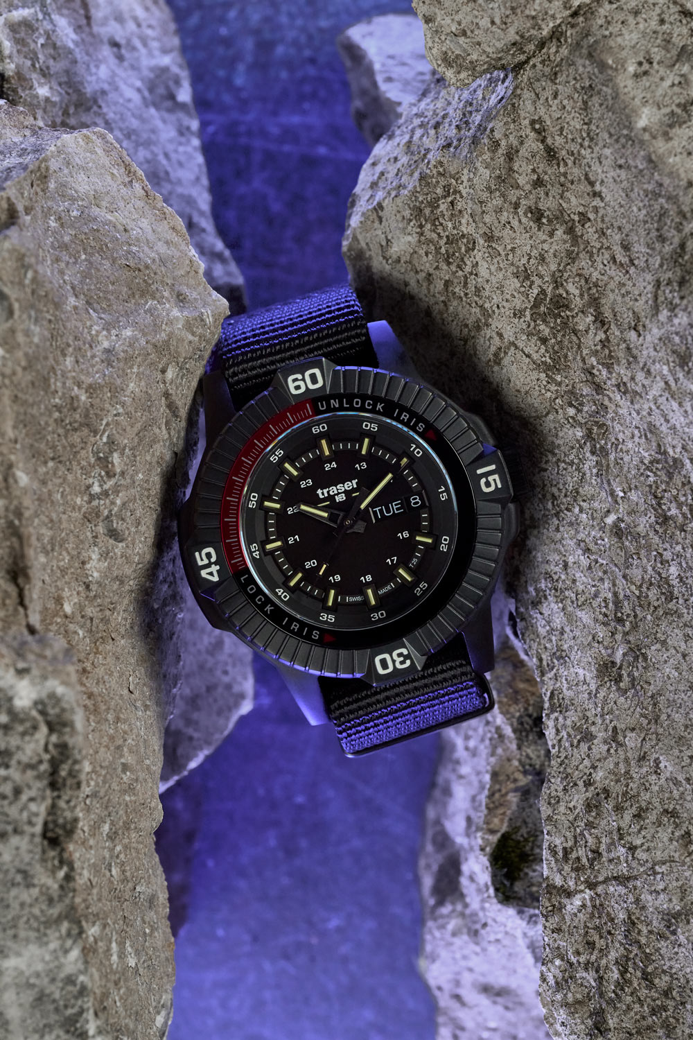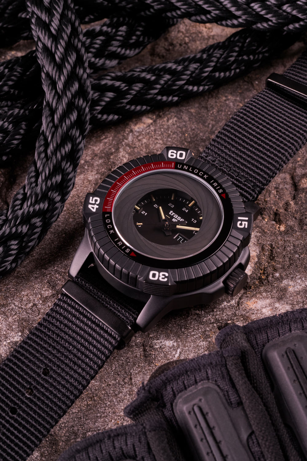 Pouzdro o průměru 46 mm z ušlechtilé oceli s černou PVD vrstvou a odolné safírové sklíčko s antireflexní úpravou zajišťují odolnost proti nárazům a vodě i při plavání do hloubky přibližně 100 metrů. Vestavěný systém Iris umožňuje během několika sekund uzavřít nebo otevřít clonu nad ciferníkem pomocí otočení lunety, čímž lze rychle přejít od plné viditelnosti k úplnému zatemnění. Toto řešení, dosud nevídané v hodinářství, je kombinováno s nejnovější generací Super Powered trigalight®, která zaručuje jasnou čitelnost bez nutnosti dobíjení světlem.