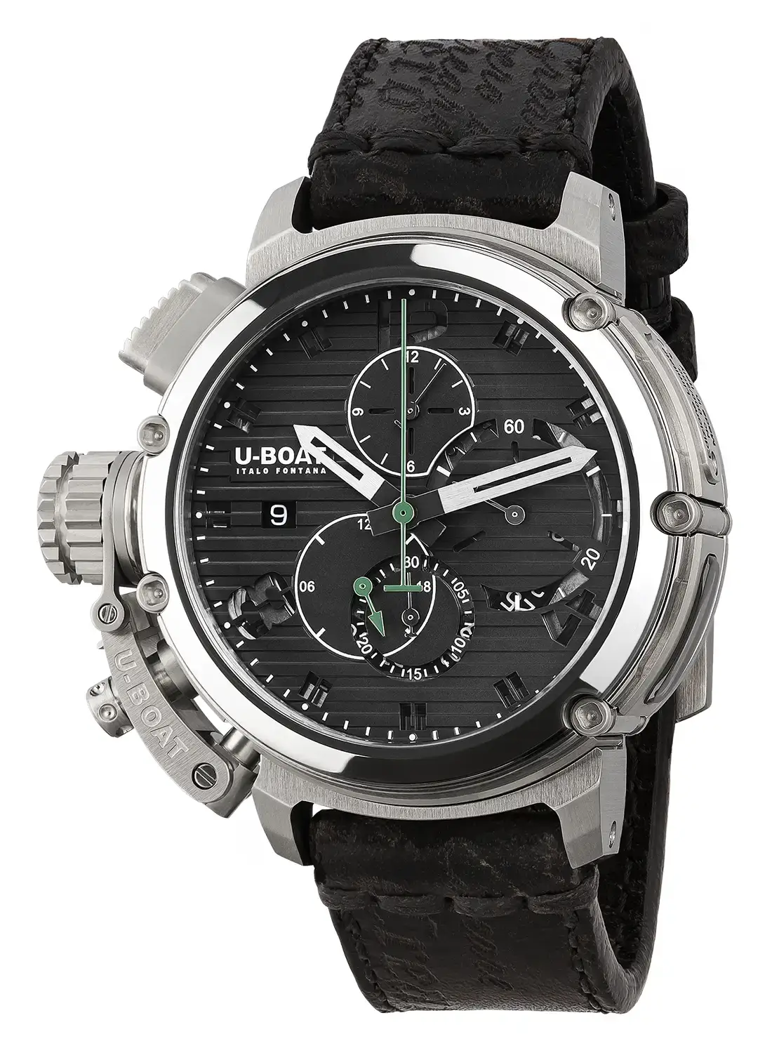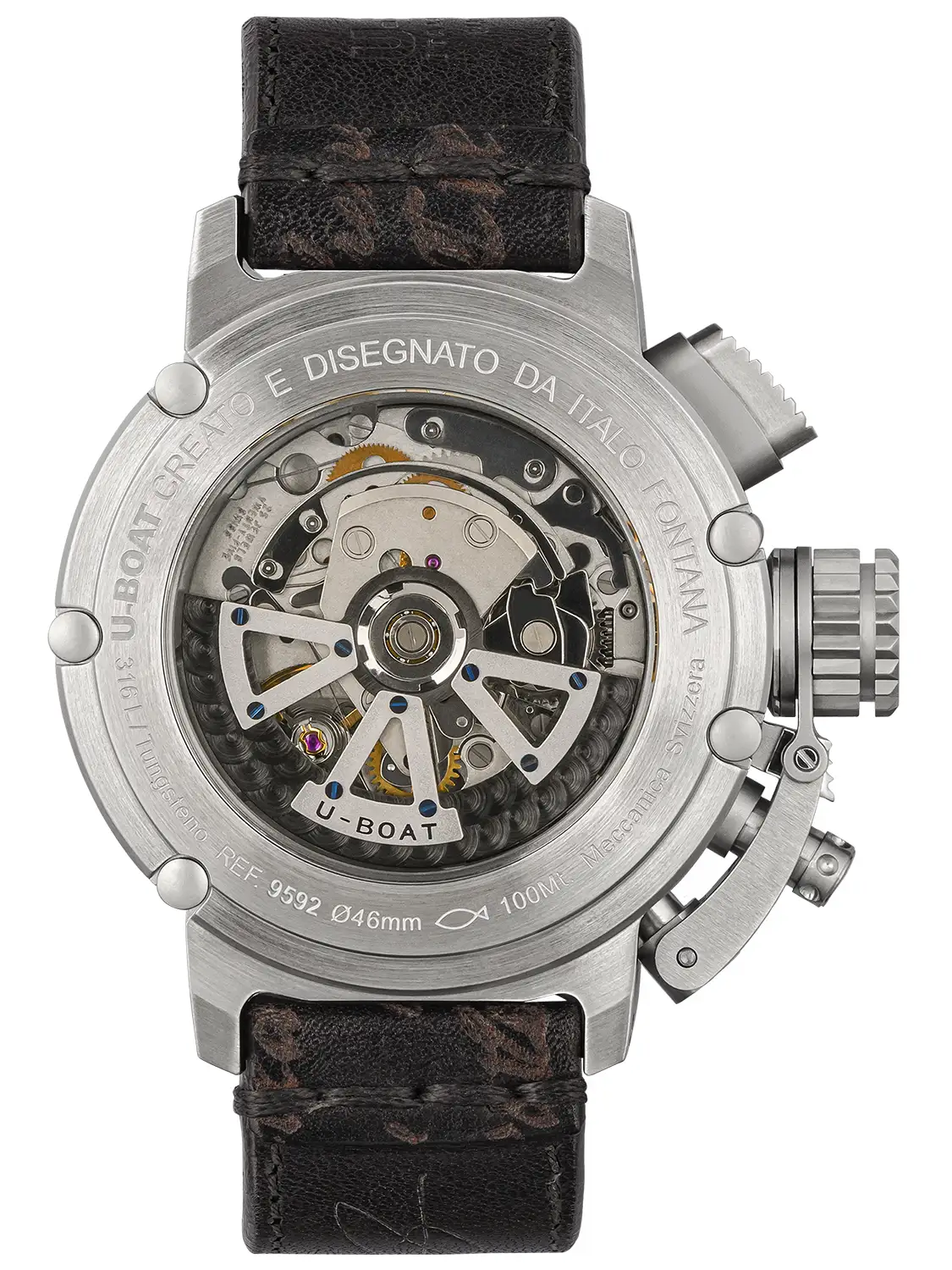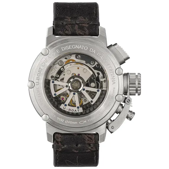 Pouzdro o průměru 46 mm, vyrobené z vysoce kvalitní nerezové oceli AISI 316L, zaručuje odolnost vůči poškození i pohodlí při nošení. Díky velké šroubovací korunce s patentovaným uvolňovacím mechanismem (Crown Release System), umístěné na levé straně, je nastavení času a data maximálně pohodlné. Šroubovací zadní víčko odhaluje oscilující rotor U-BOAT z mosazi a wolframu, zdobený perláží a rhodiem. Systém pěti vnějších šroubů a speciální klíč garantují vodotěsnost do 100 metrů. Optické safírové sklo s antireflexní vrstvou zajišťuje výbornou čitelnost ciferníku za všech podmínek a zároveň zdůrazňuje jeho vzhled. Mechanismus Sellita SW500 s prodlouženou rezervou chodu až na 62 hodin, pečlivě přizpůsobený společností U-BOAT, je srdcem hodinek, zatímco ručně vyráběný kožený řemínek zdobený voskovanými bavlněnými stehy přidává na eleganci a zdůrazňuje jedinečnost tohoto modelu.