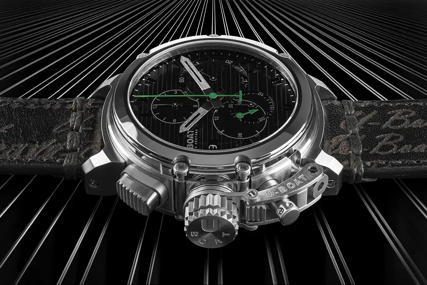 Automatický chronograf U-BOAT Chimera Chrono se vyznačuje fascinujícím dvouúrovňovým ciferníkem s vlnitou texturou, zdobeným elegantními horizontálními pruhy, které dodávají modelu nezaměnitelný a živý charakter. Díky speciálním otvorům na horní úrovni, odhalujícím kartáčovaný kovový základ, nabízí model dynamický vizuální efekt, který poutá pozornost. Leštěná luneta z wolframu a precizně laserem ryté číslice a indexy přidávají na eleganci a charakteru, zatímco boční okénko z kouřového minerálního skla umocňuje hloubku celého designu. Chronograf je vybaven třemi počítadly sladěnými s odstíny ciferníku, zatímco čtvrté 24hodinové počítadlo doplňuje sofistikovanou estetiku.