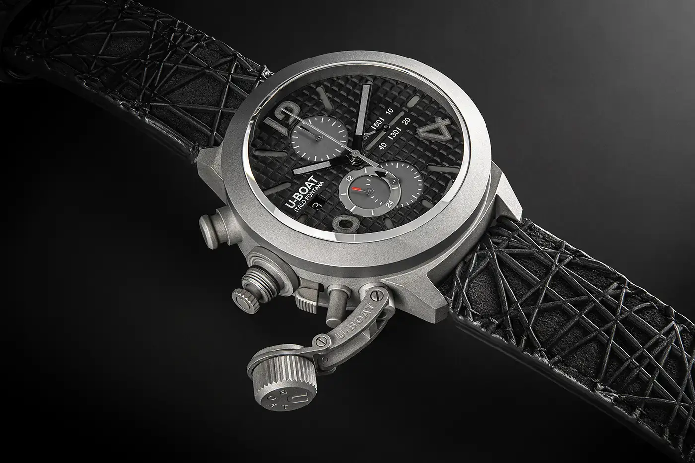 Limitovaná pánská hodinka U-BOAT Classico 45 Titanium Tungsteno Black 3004 spojuje preciznost, odolnost a nadčasový design. Pouzdro o průměru 45 mm, vyrobené z titanu třídy 2, poskytuje výjimečnou lehkost a zároveň vysokou odolnost proti poškození, zatímco matná wolframová luneta zaručuje neuvěřitelnou odolnost proti poškrábání. Tříúrovňový číselník fascinuje svým designem – jeho černá struktura „carrés“ evokuje sílu a tajemství, zatímco jemně kontrastní prvky dodávají hloubku a výraznost. Indexy v nízkém reliéfu a číslice ve vysokém reliéfu, pokryté šedou SuperLuminovou®, zajišťují čitelnost i ve tmě, stejně jako kovové ručky ve stejném odstínu. Další akcent přidává červená 24hodinová ručka, která usnadňuje čtení času v denním režimu. Celý číselník chrání safírové sklo s antireflexní úpravou, která zajišťuje dokonalou viditelnost za všech podmínek.