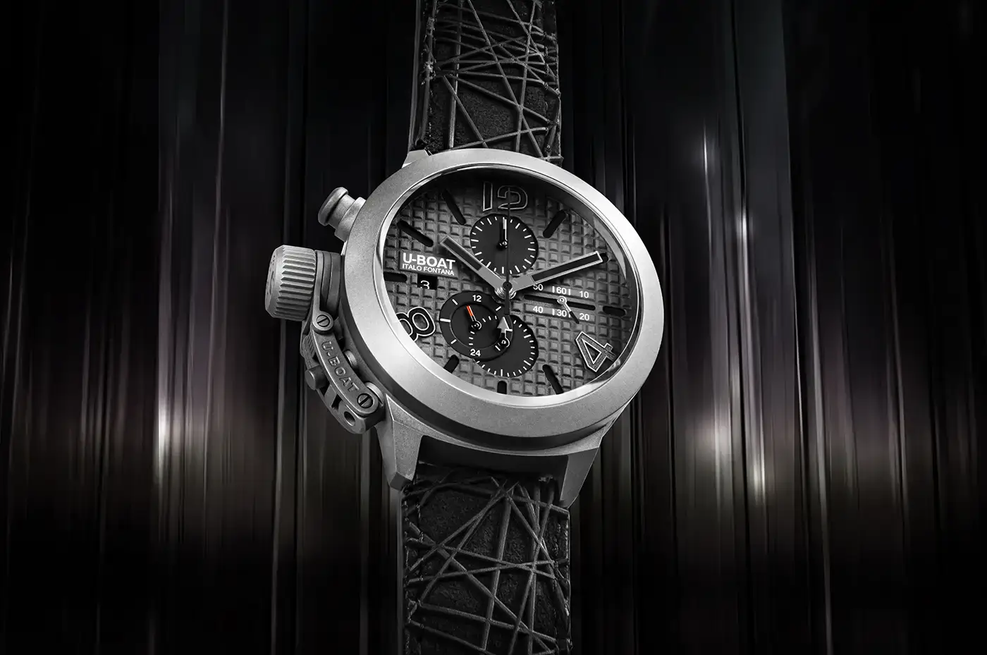 Limitované pánské hodinky U-BOAT Classico 45 Titanium Tungsteno Gray 3002 spojují preciznost, odolnost a nadčasový design. Pouzdro o průměru 45 mm, vyrobené z titanu třídy 2, poskytuje výjimečnou lehkost a zároveň vysokou odolnost proti poškození, zatímco matná wolframová luneta zaručuje neuvěřitelnou odolnost proti poškrábání. Tříúrovňový číselník fascinuje svým designem – jeho šedá struktura „carrés“ evokuje sílu a tajemství, zatímco jemně kontrastní prvky dodávají hloubku a výraznost. Indexy v nízkém reliéfu a číslice ve vysokém reliéfu, pokryté černou SuperLuminovou®, zajišťují čitelnost i ve tmě, stejně jako kovové ručky ve stejném odstínu. Další akcent přidává červená 24hodinová ručka, která usnadňuje čtení času v denním režimu. Celý číselník chrání safírové sklo s antireflexní úpravou, která zajišťuje dokonalou viditelnost za všech podmínek.