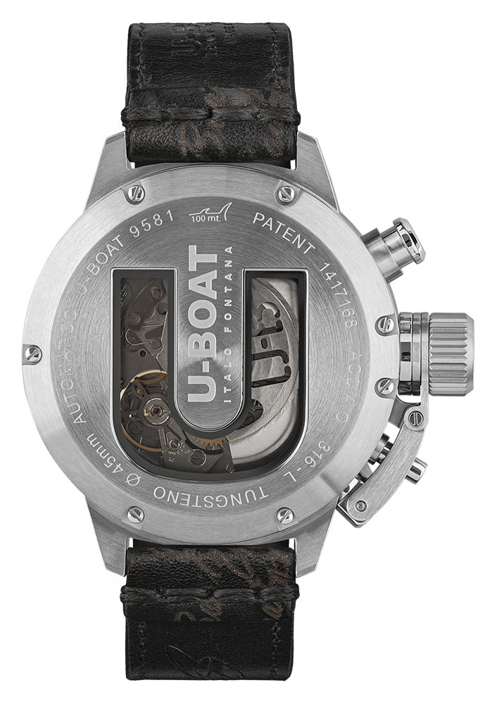 Zadní kryt je vyroben z oceli, utěsněný 7 šrouby, a charakteristický otvor ve tvaru písmene U umožňuje obdivovat mechanismus skrze safírové sklo. Sklo je navíc pokryto vrstvou antireflexního nátěru, což zajišťuje dokonalou viditelnost. Řemínek hodinek je vyroben z černé laserem starané kůže. Ručně vytvořený v Toskánsku zkušenými řemeslníky, vyniká pečlivým výběrem kůže a materiálů. Řemínek má voskované bavlněné stehy o šířce 20/20 mm, a spínadlo je vyrobeno ze stali, což zajišťuje pevné a stylové uzavření.
