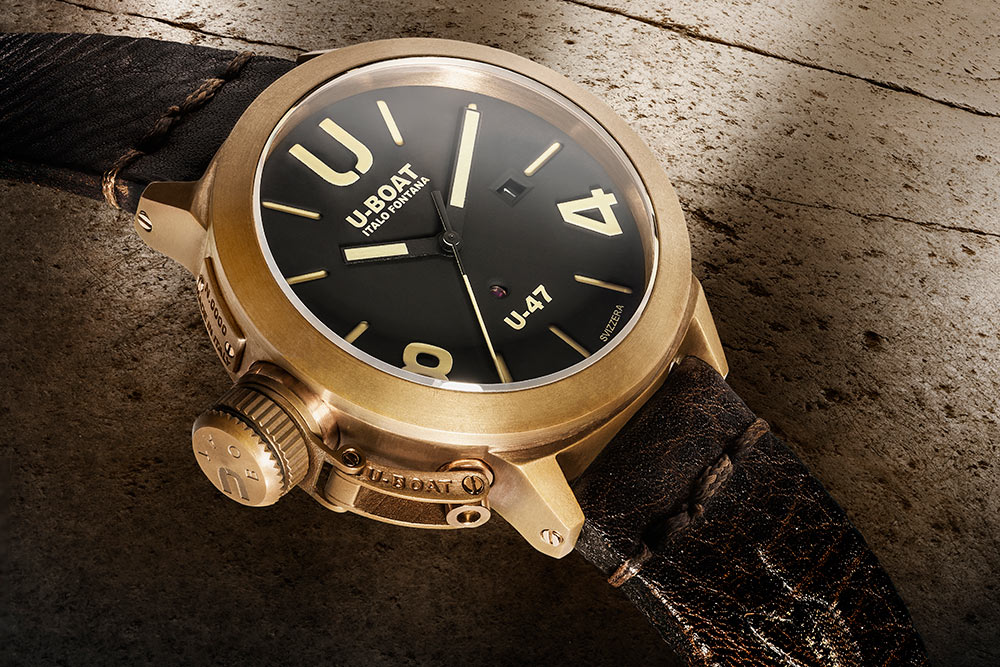 U-BOAT Classico U-47 Bronze 7797 je model, který si každý spojuje s italským klimatem od samého počátku. Velmi jasný a zaostřený černý ciferník zaujme nejen svou intenzivní barvou. Jeho další předností je hluboká a vícestupňová konstrukce, která se skládá jak z béžových, řezaných indexů, tak i fyzicky aplikovaných prvků – arabských číslic, log nebo ručiček. Celek spolu s velkým písmenem "U", nahrazujícím dvanáctou hodinu, vyplňuje svítící ve tmě superluminova, která zlepšuje čtení v tmavých místnostech nebo pozdě v noci. Další vzácností, kterou na číselníku najdeme, je zdobení - syntetický rubín, který je odkrytou součástí švýcarského Machineku.