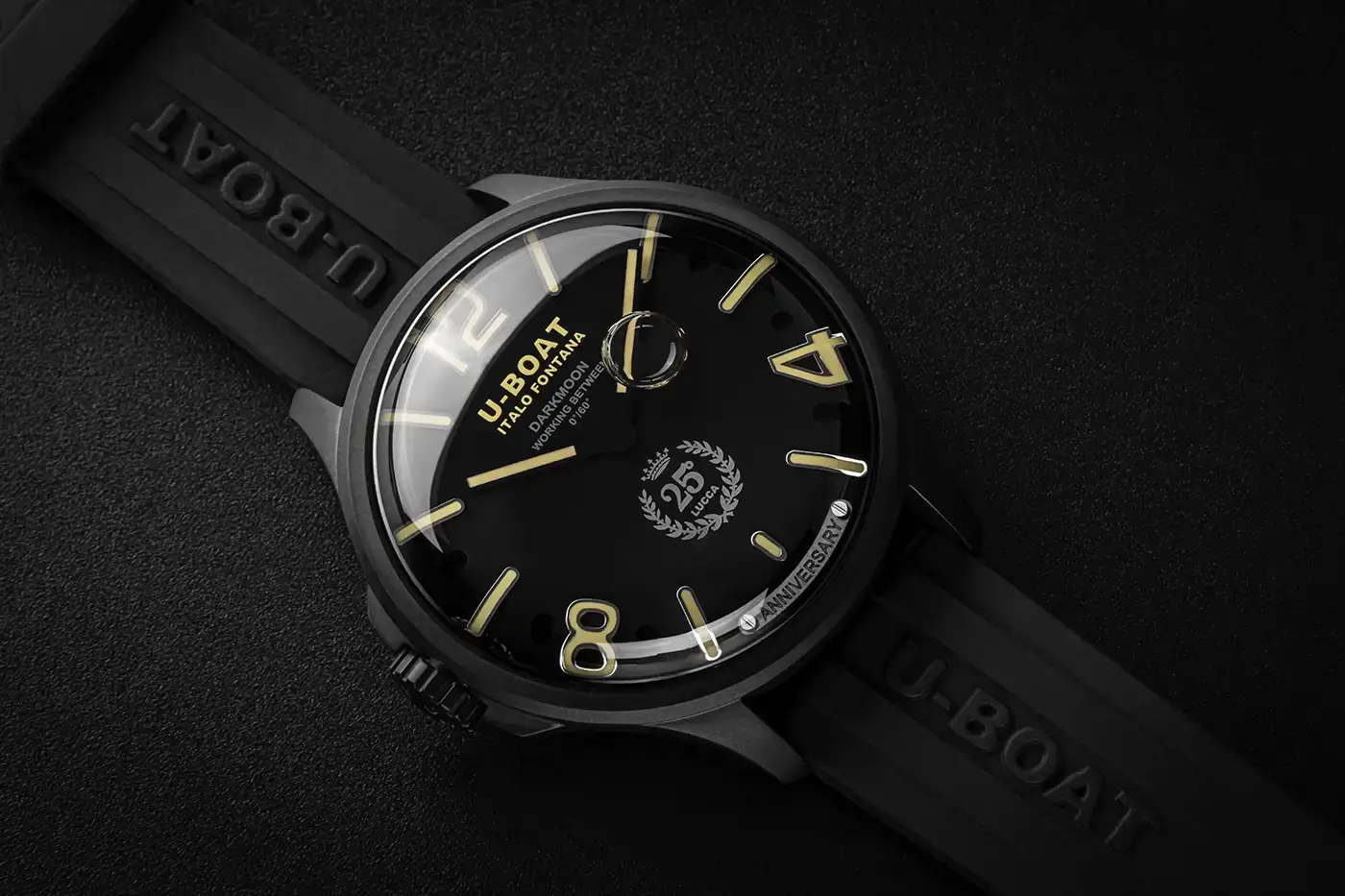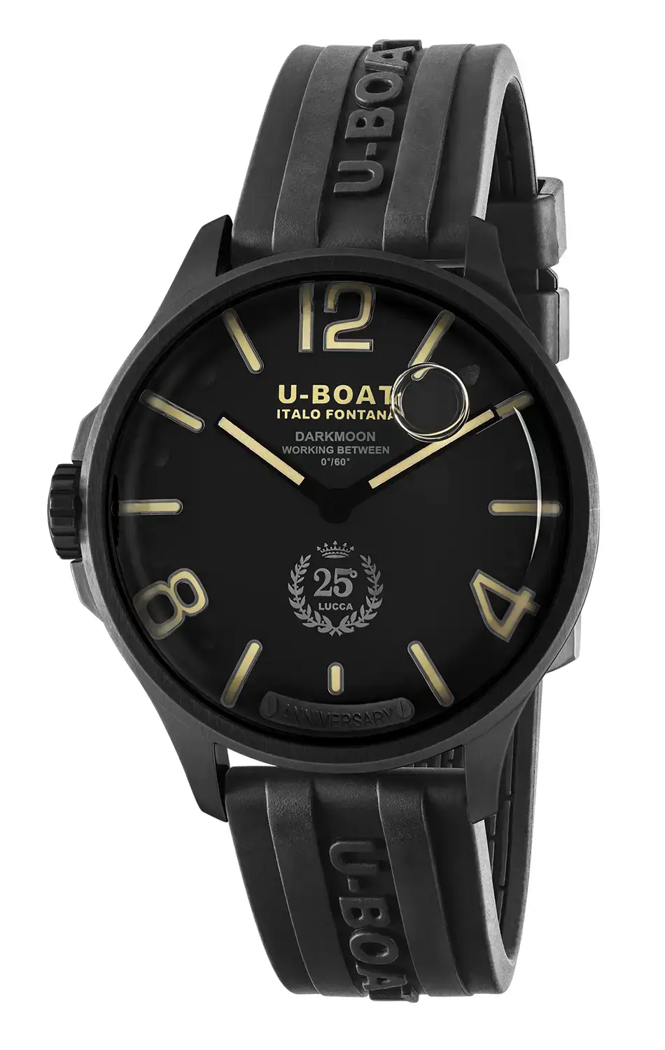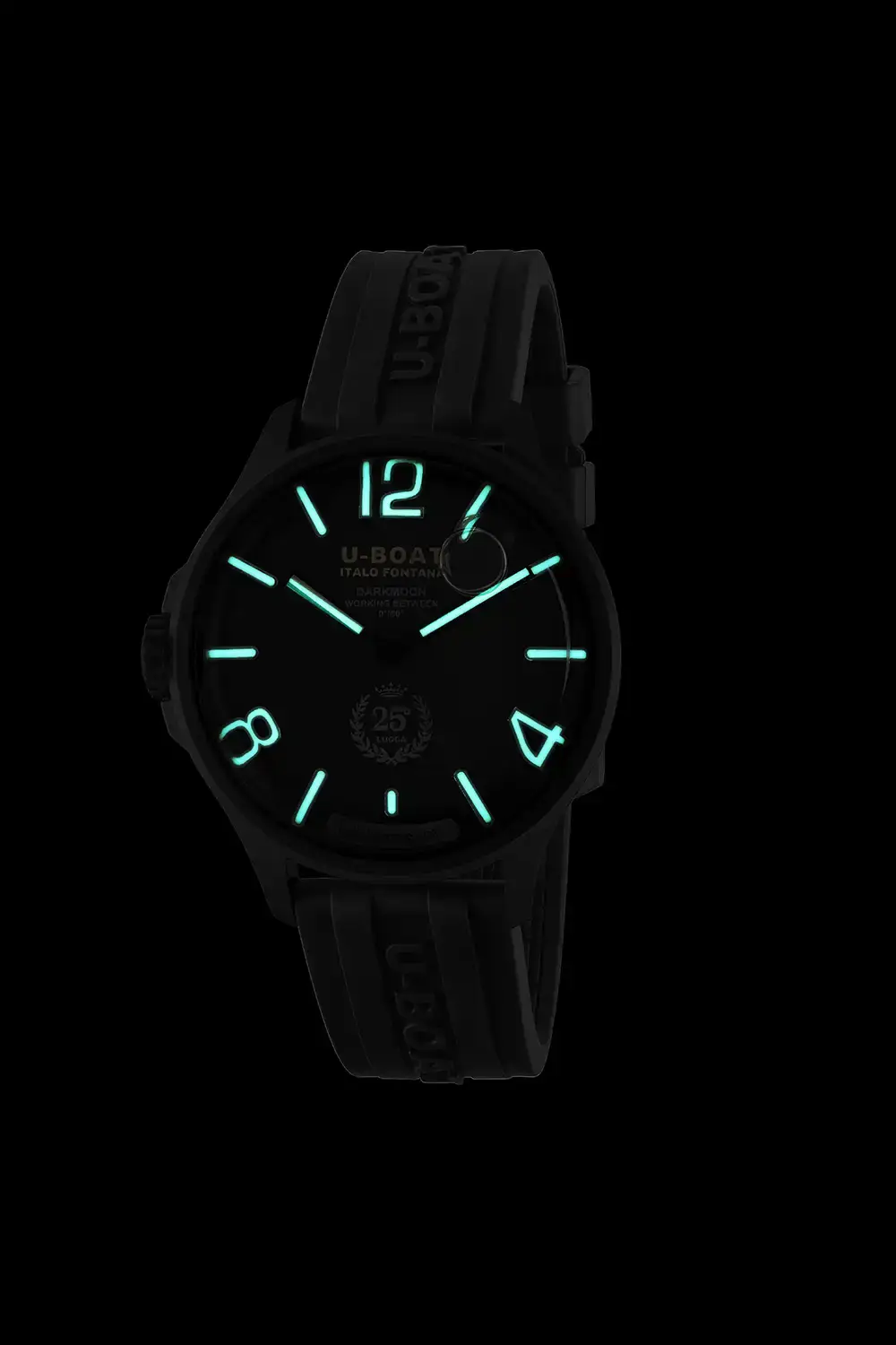 U-BOAT Darkmoon 25° Anniversary Black PVD jsou černé hodinky s olejem o impozantním průměru 46,5 mm, určené pro znalce, kteří hledají výjimečný styl a technologickou vytříbenost. Řemínek z ultraodolné vulkanizované gumy, zdobený plastickým logem značky, doplňuje celek a nabízí bezkonkurenční pohodlí při nošení i vysokou vnímanou hodnotu.