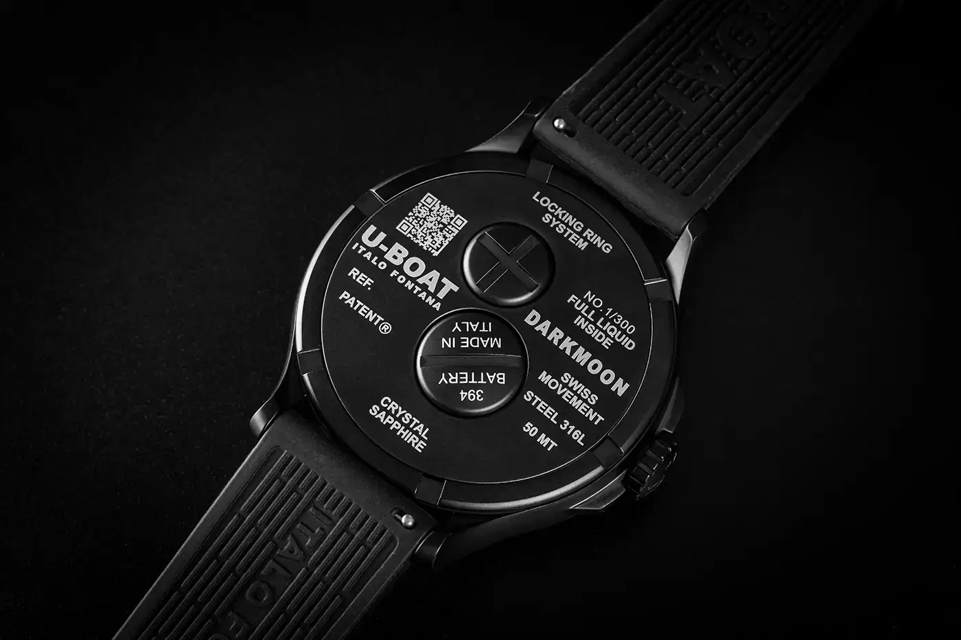 Hodinky U-BOAT ponořené v oleji jsou vyrobeny z nejkvalitnější oceli AISI 316L s černou PVD úpravou, která celému designu dodává tajemný nádech a skvěle ladí se zeleným gradientním číselníkem. Křemíkový strojek Ronda 762, obklopený olejovou lázní, zajišťuje nejen mimořádnou přesnost, ale i výjimečný optický efekt, kdy sklo jakoby mizí a zůstává jen čistý obraz času. Zadní víčko hodinek, které jsou vodotěsné do cca 50 metrů (sprchování/koupání), skrývá inovativní systém rychlé výměny baterie. Je doplněno o laserem gravírované sériové číslo a QR kód, který otevírá přístup k exkluzivní digitální verzi – důkaz pravosti a individuality každého kusu.