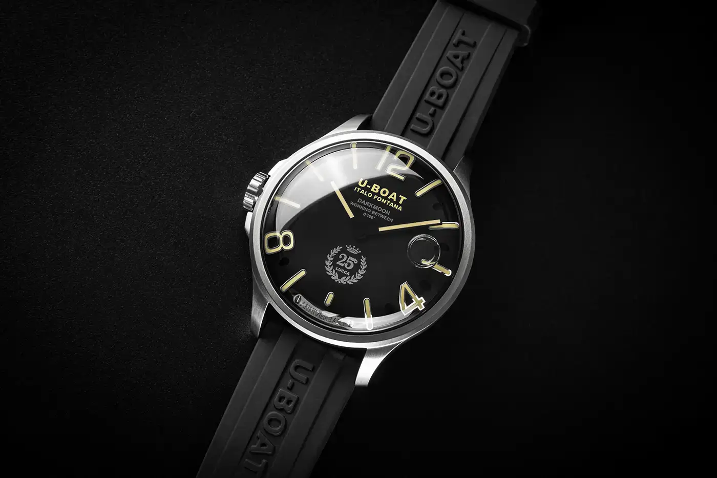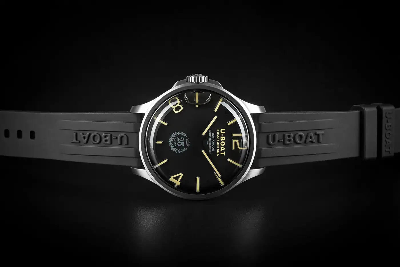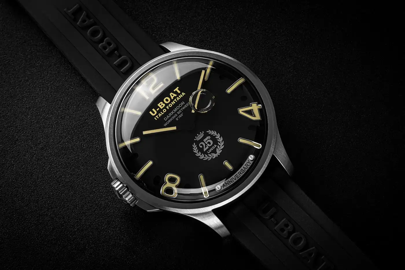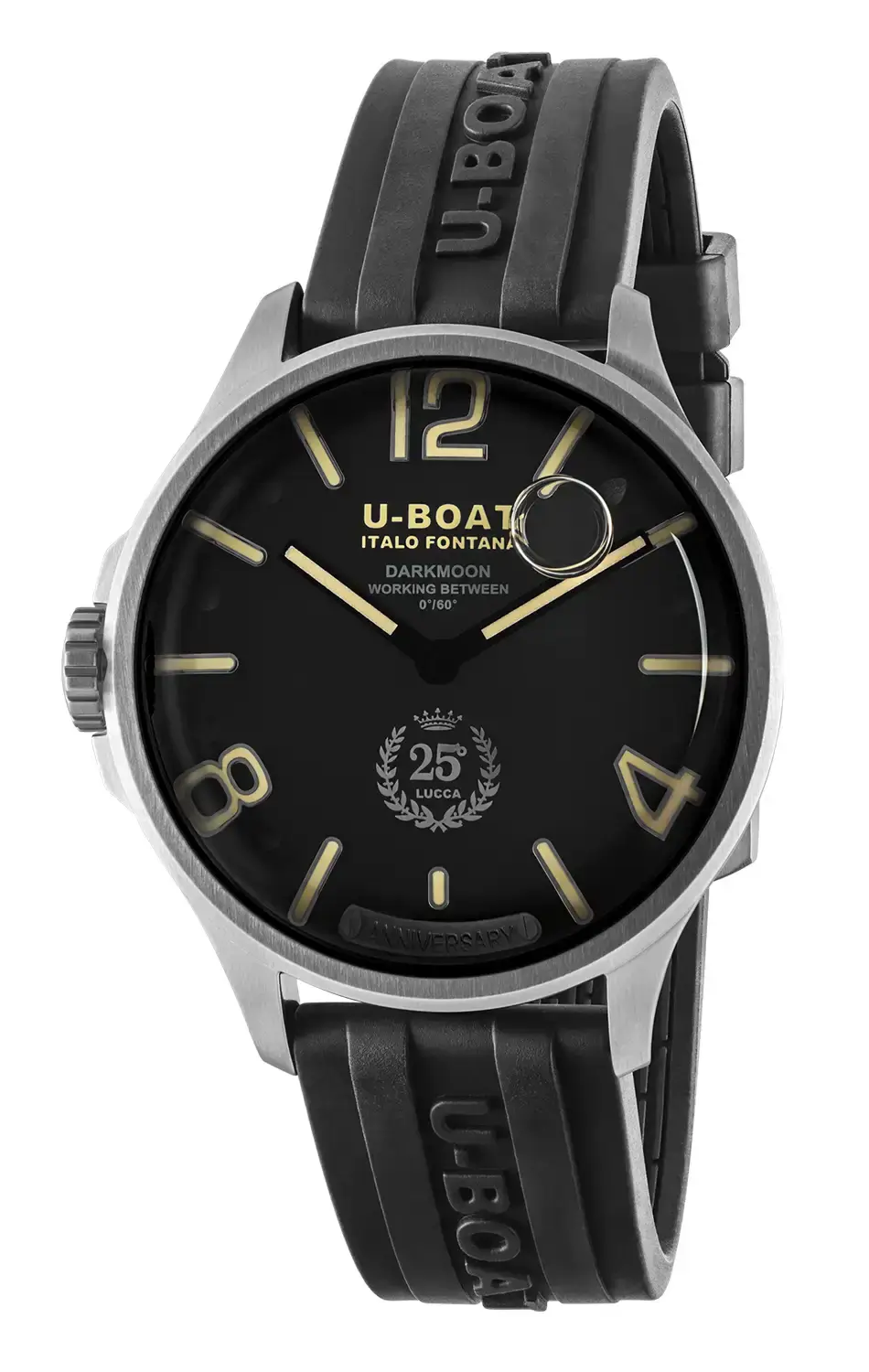 U-BOAT Darkmoon 25° Anniversary SS Black jsou černé hodinky s olejovou technologií o působivém průměru 46,5 mm, určené pro znalce hledající výjimečný styl a technickou vytříbenost. Řemínek z ultra odolné vulkanizované gumy, zdobený plastickým logem značky, dotváří celek a poskytuje výjimečné pohodlí při nošení i vysokou vnímanou hodnotu.