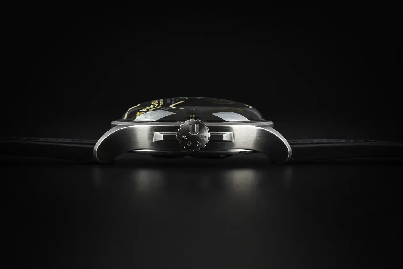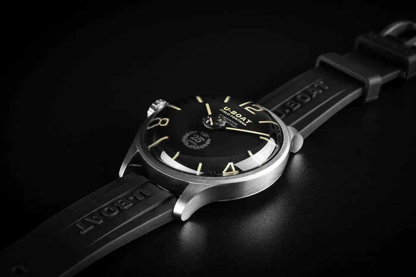 Limitované pánské hodinky U-BOAT Darkmoon 25° SS Black Limited Edition 2027 jsou výjimečnou sběratelskou edicí, vytvořenou k 25. výročí značky — pocta nezávislému duchu a toskánské hodinářské vizi. Model vyrobený v pouhých 300 číslovaných kusech spojuje odvážný design s pokročilou technologií olejové immersní komory, která dodává číselníku hypnotickou hloubku a sytost barev. Vypouklé safírové sklíčko a výrazné trojrozměrné indexy umocňují dojem „pulzujícího času“, zatímco jubilejní detaily, jako pamětní plaketa a logo 25° LUCCA, podtrhují prestiž tohoto modelu.
