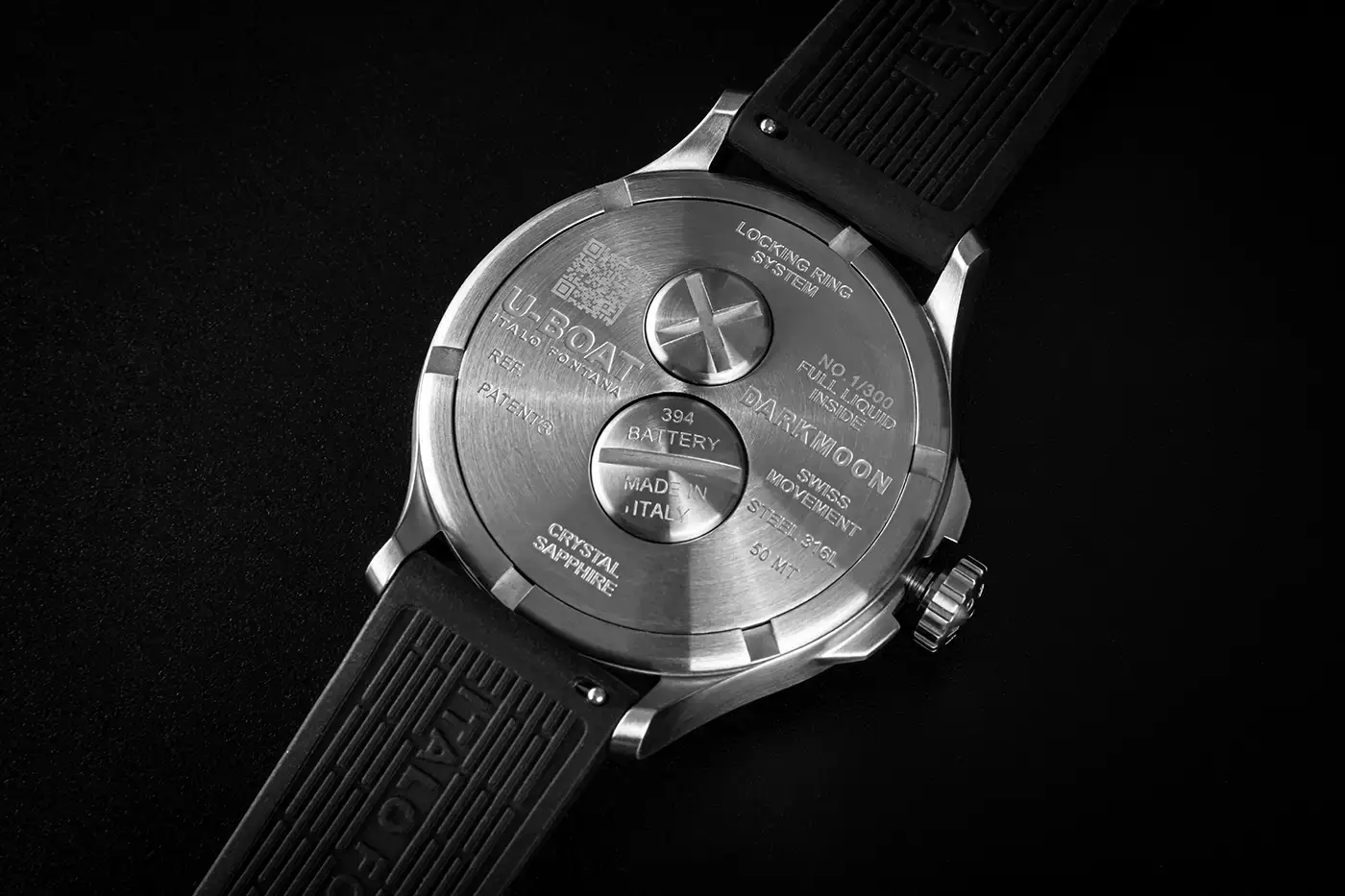 Olejově napuštěné hodinky U-BOAT jsou vyrobeny z nejkvalitnější nerezové oceli AISI 316L, která zvýrazňuje surovou eleganci designu a dokonale ladí s černým číselníkem s jemně saténovou úpravou. Křemenný strojek Ronda 762, ponořený v olejové lázni, poskytuje nejen mimořádnou přesnost, ale i výjimečný optický efekt, díky kterému sklíčko téměř mizí, zanechávající jen čistý obraz času. Dýnko hodinek s vodotěsností do 50 metrů (sprcha/koupel) ukrývá inovativní systém rychlé výměny baterie. Je doplněno o laserem gravírované sériové číslo a QR kód, který zpřístupňuje exkluzivní digitální obsah — důkaz pravosti a jedinečnosti každého kusu.