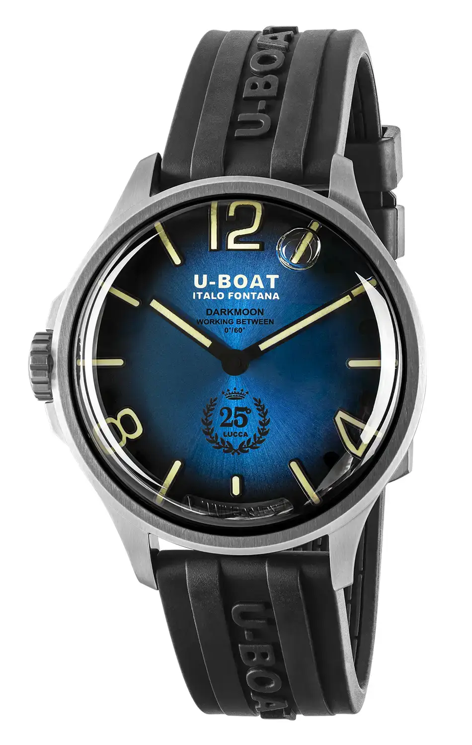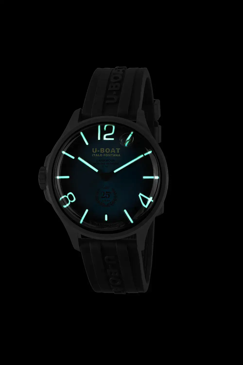 U-BOAT Darkmoon 25° Anniversary SS Blue Soleil jsou olejové hodinky s působivým průměrem 46,5 mm, vytvořené pro znalce, kteří hledají výjimečný styl a technologickou vytříbenost. Řemínek z extrémně odolné vulkanizované gumy, zdobený plastickým logem značky, doplňuje celek a nabízí bezkonkurenční pohodlí při nošení a vysoký pocitový luxus.