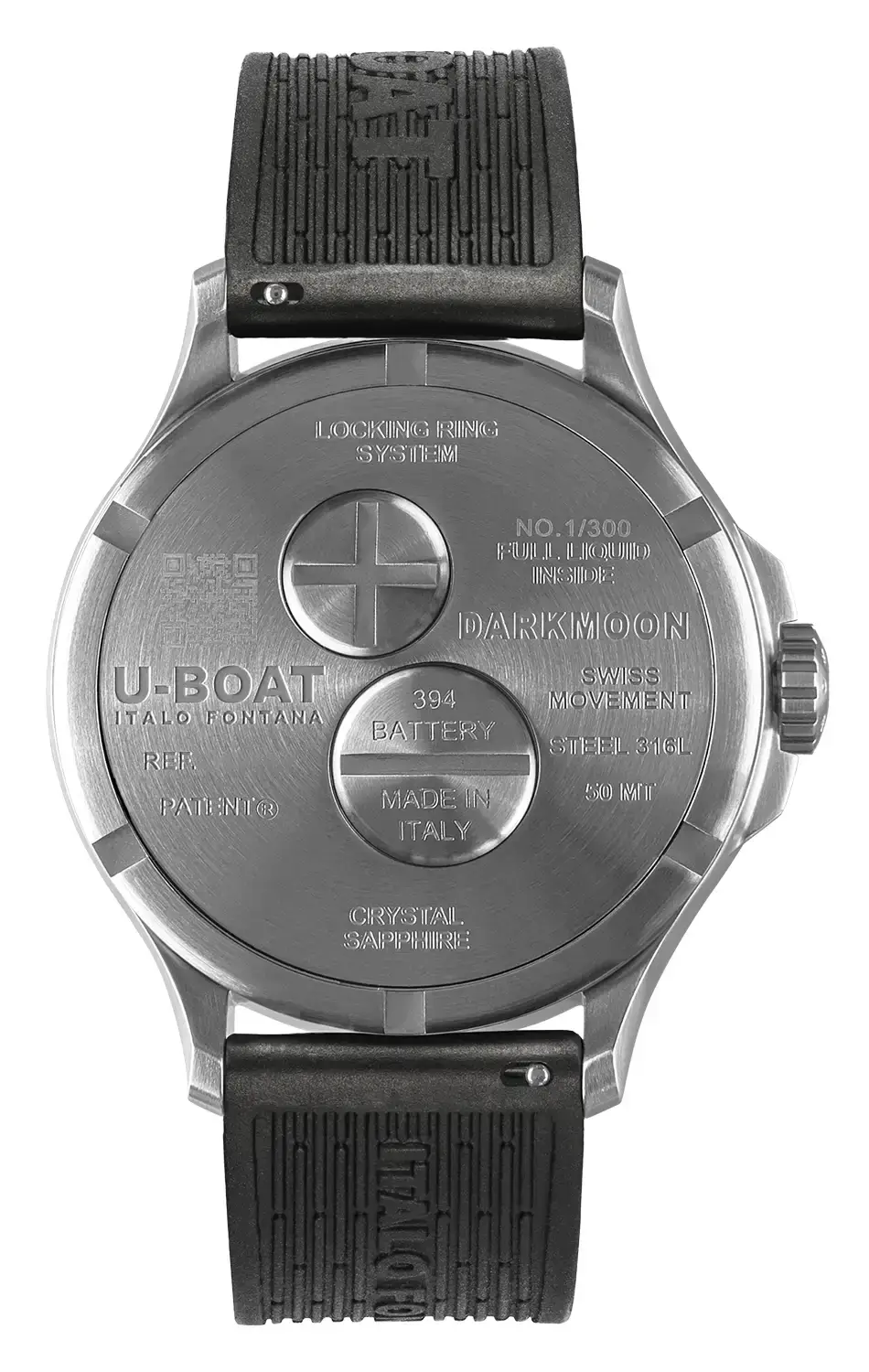 Hodinky U-BOAT ponořené v oleji jsou vyrobeny z nejkvalitnější nerezové oceli AISI 316L, která zdůrazňuje syrovou eleganci designu a harmonicky ladí s modrým číselníkem s gradientním efektem. Křemenný strojek Ronda 762 v olejové lázni zajišťuje nejen mimořádnou přesnost, ale i jedinečný optický efekt — jako by sklíčko zmizelo a zanechalo pouze čistý obraz času. Zadní víko hodinek, které poskytují voděodolnost do cca 50 metrů (sprchování/koupel), ukrývá inovativní systém rychlé výměny baterie. Je doplněno o laserem gravírované sériové číslo a QR kód, který zpřístupňuje exkluzivní digitální verzi – důkaz autenticity a jedinečnosti každého kusu.