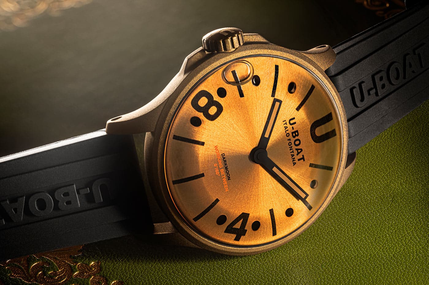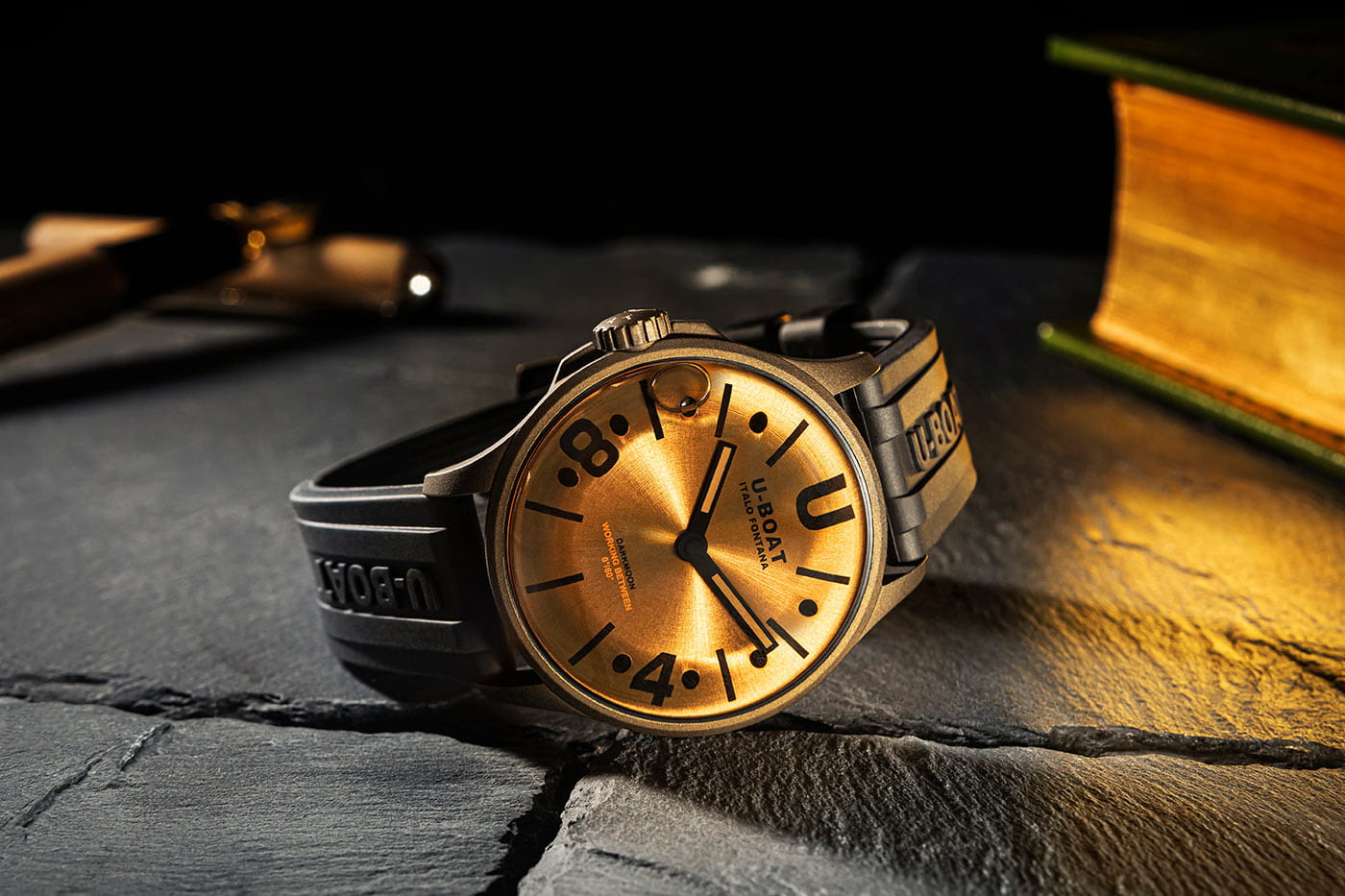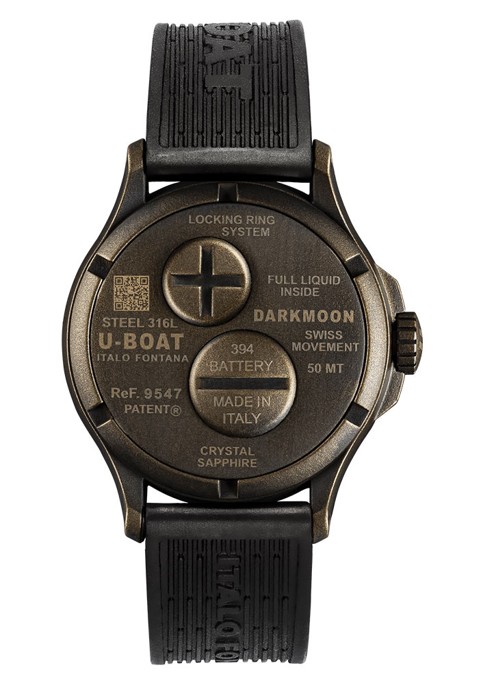 Pánské hodinky s bronzovým pouzdrem od značky U-BOAT Italo Fontana jsou vybaveny švýcarským mechanizmem kvartzovým Ronda 712.3, mazaným v olejové lázni, což zaručuje přesnost a spolehlivost. Speciální olej vyplňující zlatý ciferník vytváří iluzi absence skla, intenzifikuje barvu a zlepšuje čitelnost. Viditelná bublina vzduchu na ciferníku kompenzuje teplotní výkyvy. Charakteristický levý kryt šroubovatelné korunky dodává výrobku jedinečný vzhled. Kovový ciferník s povrchovou úpravou typu soleil má indexy a čísla pokryté povlakem Super-Luminova, což zajišťuje čitelnost i v tmě. Ukazatele z malovaného kovu mají světelný povlak v barvě bronzu, což hodinkám dodává vintage charakter. Celé je chráněno exkluzivním sférickým safírovým sklem odolným proti poškrábání.
