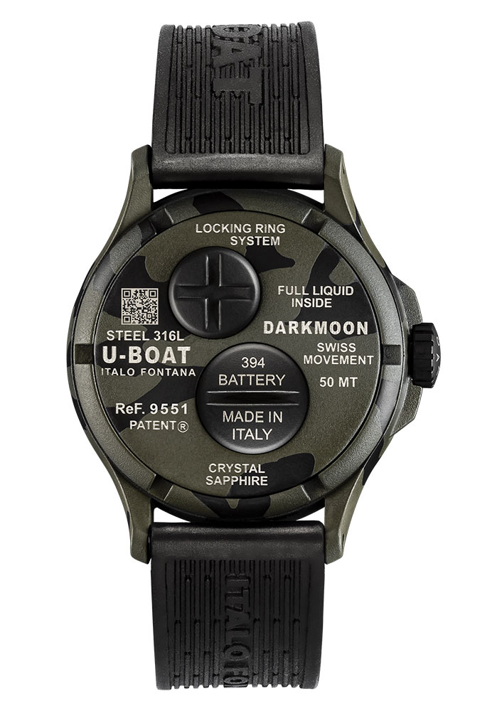 Pánské hodinky s vojenským vzorem pouzdra od značky U-BOAT Italo Fontana jsou vybaveny švýcarským mechanizmem kvartzovým Ronda 712.3, mazaným v olejové lázni, což zaručuje přesnost a spolehlivost. Speciální olej vyplňující šedý ciferník vytváří iluzi absence skla, intenzifikuje barvu a zlepšuje čitelnost. Viditelná bublina vzduchu na ciferníku kompenzuje teplotní výkyvy. Charakteristický levý kryt šroubovatelné korunky dodává výrobku jedinečný vzhled. Kovový ciferník s povrchovou úpravou typu soleil má indexy a čísla pokryté povlakem Super-Luminova, což zajišťuje čitelnost i v tmě. Ukazatele z malovaného kovu mají světelný povlak v barvě šedé, což hodinkám dodává vojenský charakter. Celé je chráněno exkluzivním sférickým safírovým sklem odolným proti poškrábání.