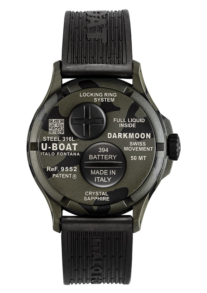 Pánské hodinky s kamuflážovým pouzdrem od značky U-BOAT Italo Fontana jsou vybaveny švýcarským kvartzním mechanismem Ronda 712.3, namazaným v olejové lázni, což zaručuje přesnost a spolehlivost. Speciální olej vyplňující zcela černý ciferník vytváří iluzi absencí skla, zesilující barvu a zlepšující čitelnost. Viditelná bublina vzduchu na ciferníku kompenzuje teplotní výkyvy. Charakteristický levý kryt šroubované korunky dodává výrobku jedinečný vzhled. Kovový ciferník s povrchem typu soleil má indexy a čísla pokryté povlakem Super-Luminova, zajišťující čitelnost i ve tmě. Ukazatele vyrobené z malovaného kovu mají povlak ve světle šedé barvě, dodávající hodinkám vintage charakter. Celkový dojem dotváří exkluzivní sférické safírové sklo odolné vůči poškrábání.