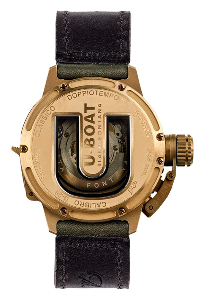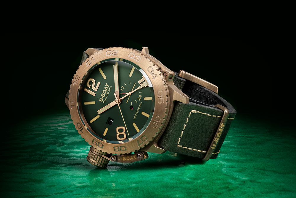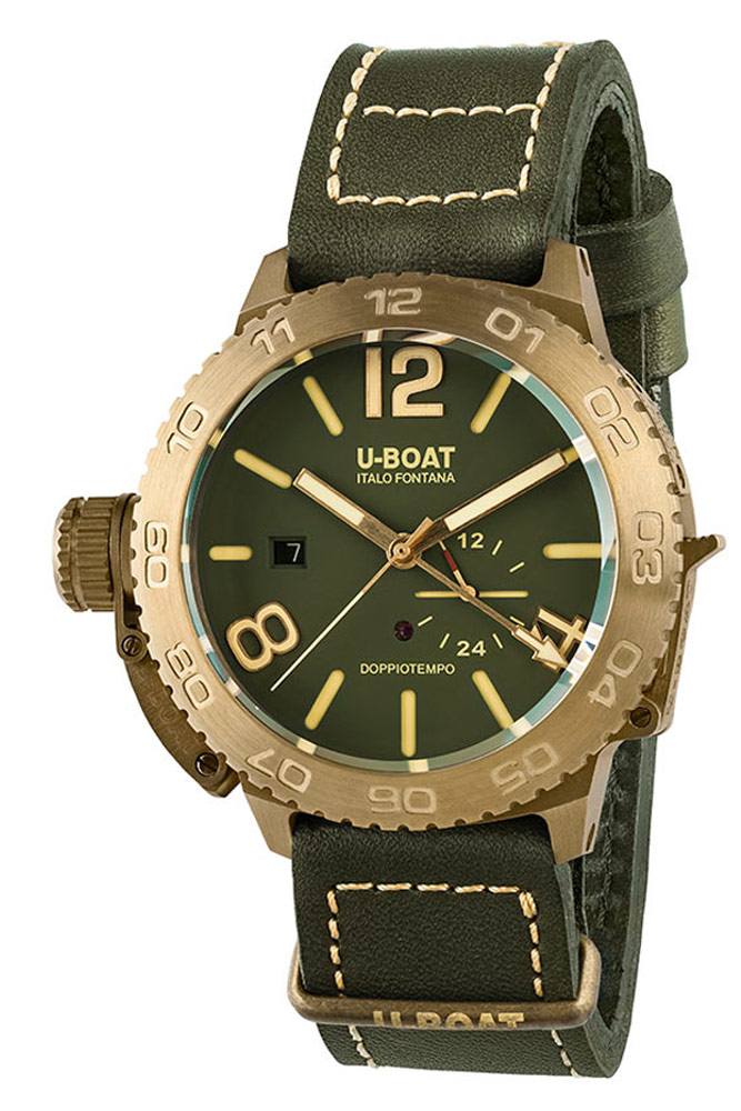 K pouzdru byla připevněna přídavná hodinová stupnice, která ve spolupráci s jednou ručičkou umožňuje uživateli orientovat se ve dvou časech současně. Jedinečný a osobitý design tvoří také reverz hodinek, který odhaluje část švýcarského Machineku v podobě koncepčního U – typického pro značku U-Boat. Vrcholem celku je kvalitní, ručně zpracovaný, zelený kožený řemínek, který skvěle doplňuje vznešenou třídu rozeznívající se z toho nejmenšího kousku hodinek. Řemínek 22/22 mm se zapíná na sponu - rovněž z bronzu.