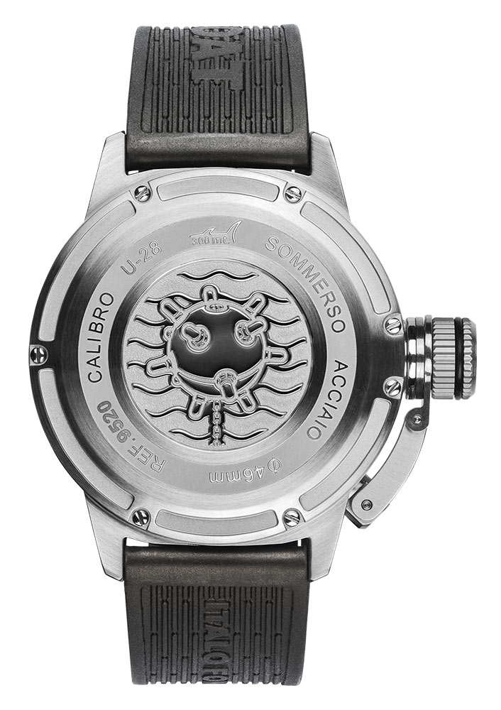 Extrémně odolný černý řemínek z vulkanizované pryže připevněný k pouzdru obsahuje personalizované embosované logo U-BOAT pro vysokou vnímanou hodnotu. Spona je ocelová. Uvnitř pouzdra těchto diverských hodinek s gumovým páskem je švýcarský automatický samonatahovací mechanismus přizpůsobený specifikacím U-BOAT. Kalibr U-28 vycházející ze Sellita SW 200 nabízí frekvenci 28 800 vibrací za hodinu, 4 Hz, rezervu chodu přibližně 41 hodin, 26 drahokamů a skeletonizovaný rotor.