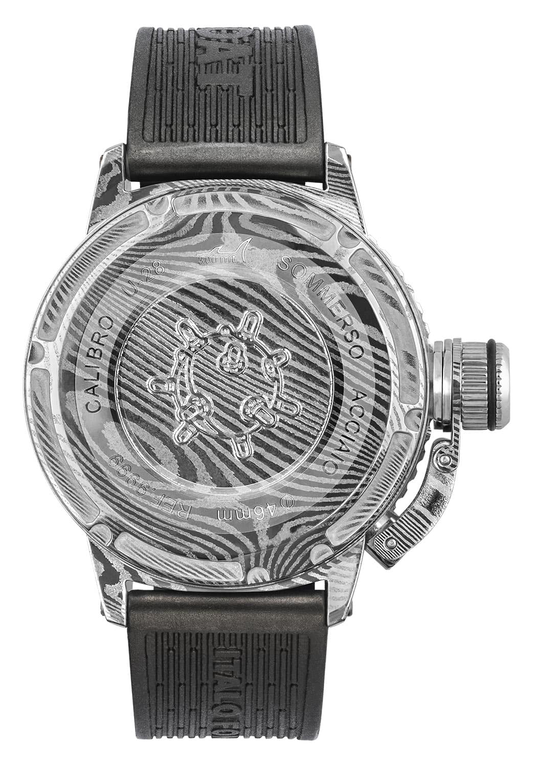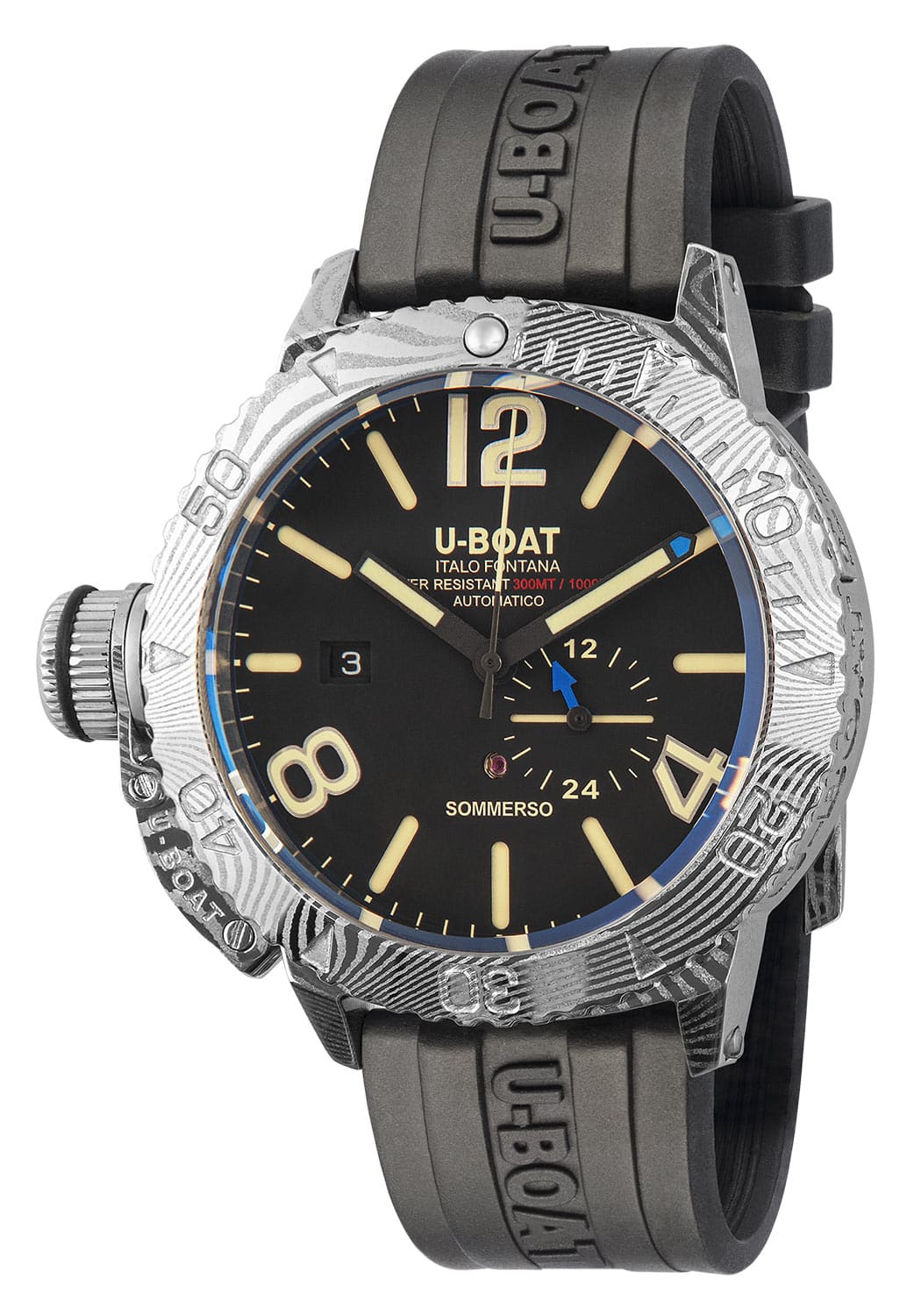 Pánské hodinky U-BOAT Sommerso Damascus 9999 spojují luxus, inovaci a italský charakter. Damašková ocel, ze které je vyrobena 46mm pouzdro vodotěsné do hloubky až 300 metrů, s jednosměrným otočným rámečkem a šroubovacím dýnkem, je materiál s bohatou historií. Vzorcová textura, charakteristická pro tento historický typ oceli, připomíná její původ ve starověké Sýrii, kde byla používána k výrobě mečů. Dnes, díky moderním technologiím, je tento materiál využíván v luxusních hodinkách, jako jsou U-BOAT Damascus.