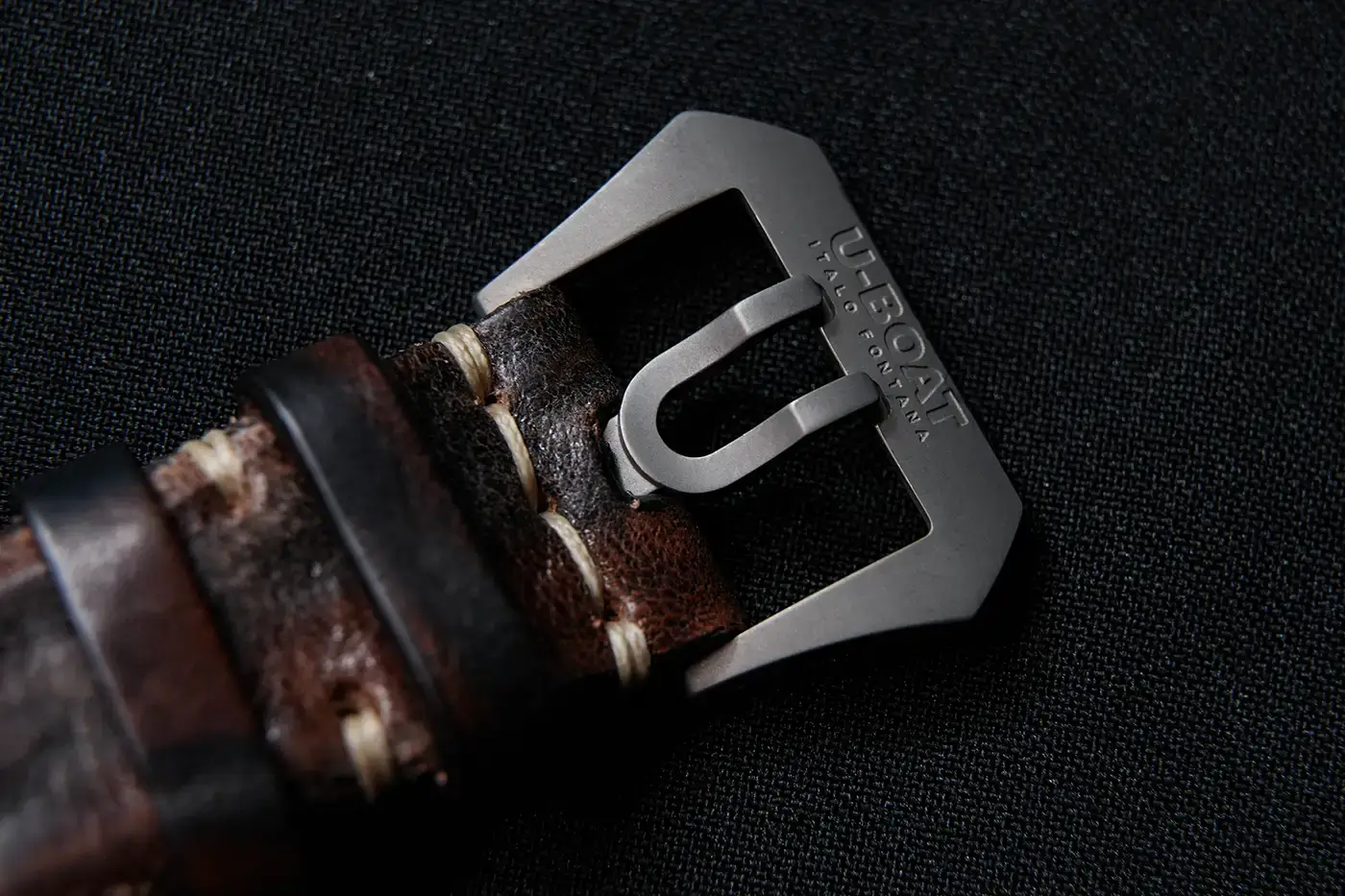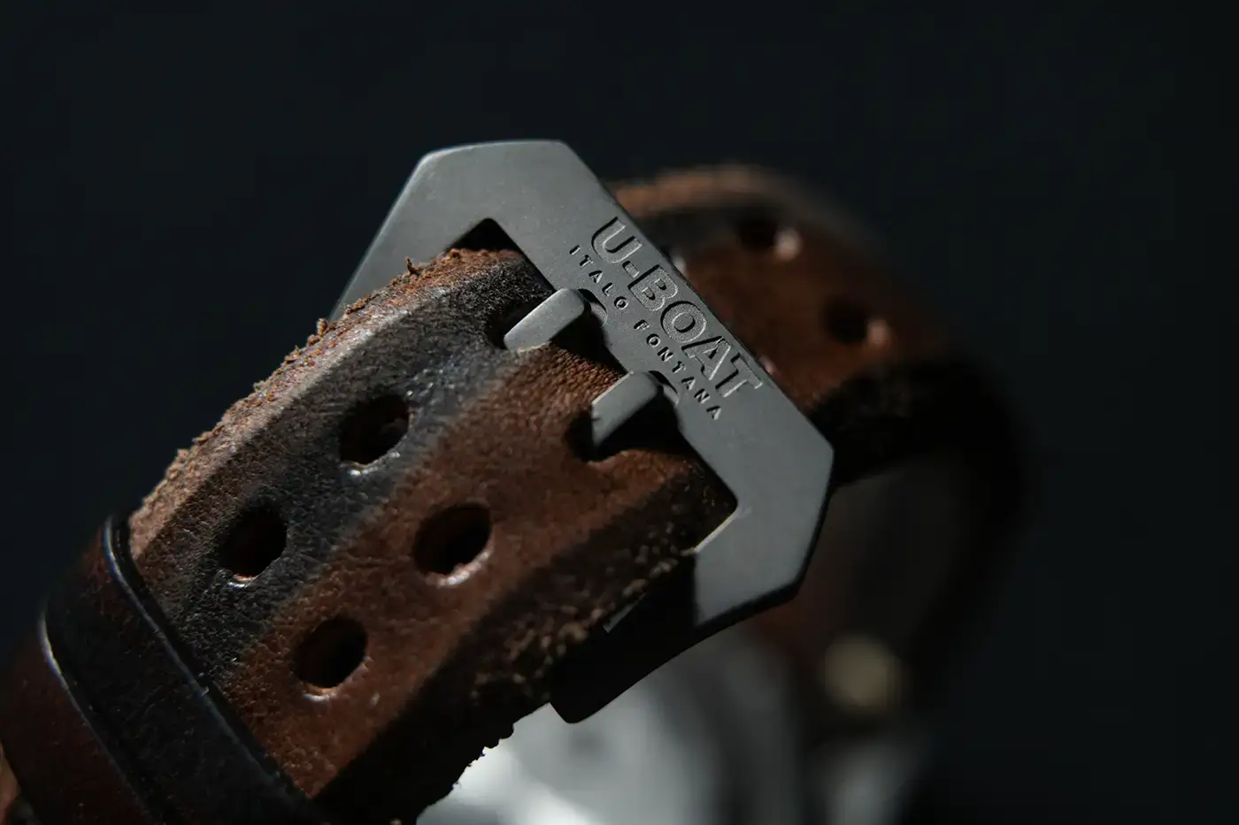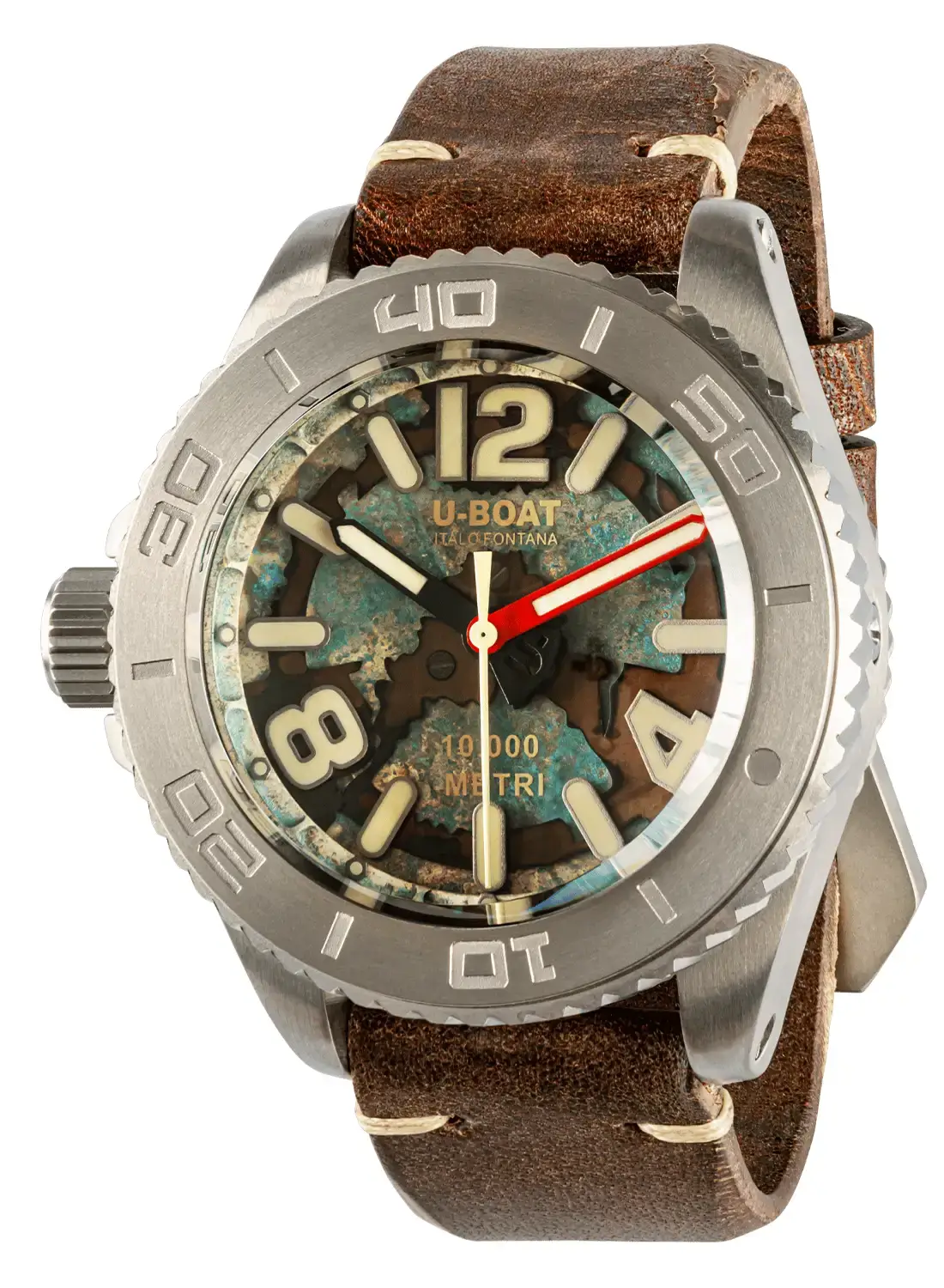 Srdcem modelu U-BOAT 3600 je automatický strojek SW 200 Sellita s 26 kameny, pracující s frekvencí 28 800 kyvů za hodinu (4 Hz) a nabízející přibližně 41hodinovou rezervu chodu. Upravený skeletonizovaný rotor s kovovou povrchovou úpravou odráží řemeslné mistrovství a smysl pro individualitu značky U-BOAT, zatímco jednosměrná titanová luneta s laserem gravírovanými značkami umožňuje přesné měření času pod vodou. Ručky a kovové indexy potažené béžovou luminiscenční vrstvou Super-LumiNova zajišťují výbornou čitelnost i ve tmě a ladí s prošitím řemínku, čímž dodávají celku výrazný nádech vintage stylu. Třívrstvý ciferník s patinovanou úpravou à la patina a nápisem U-BOAT 10.000 METRI podtrhuje jeho drsnou, námořní eleganci.