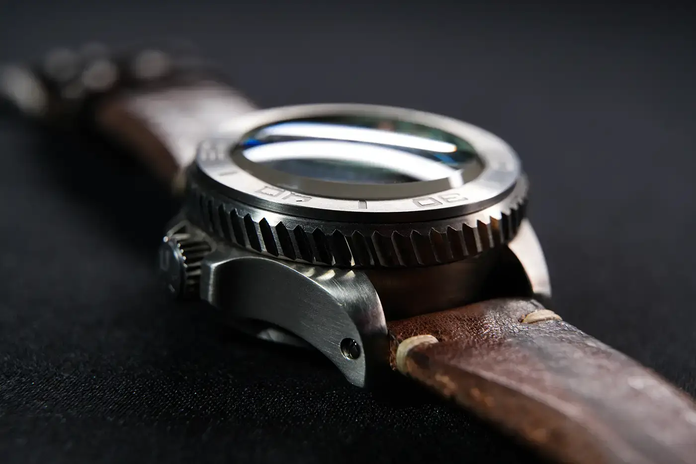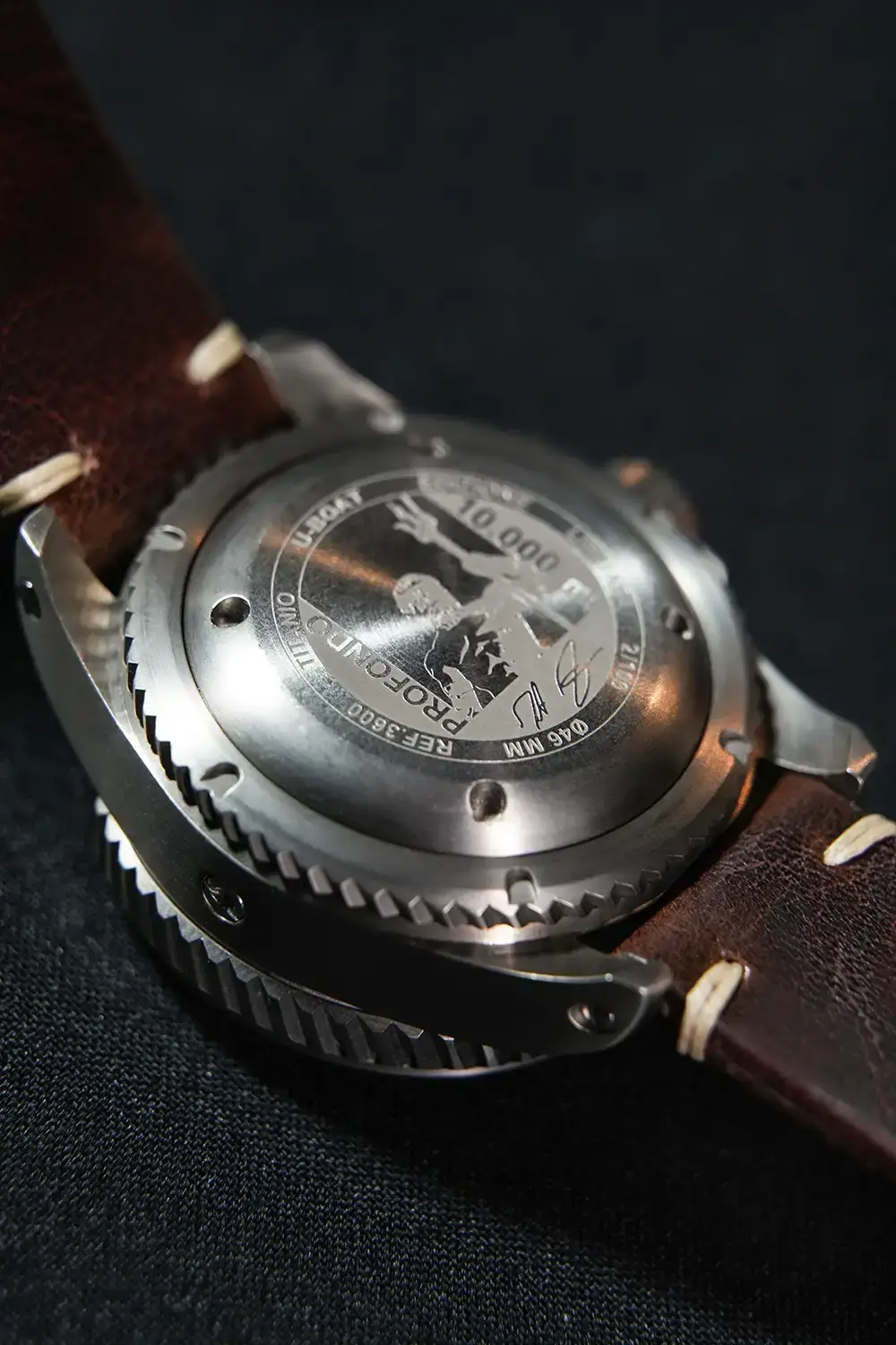 Impozantní pouzdro o průměru 46 mm a tloušťce 27 mm spolu s vypouklým safírovým sklem o tloušťce téměř 1 cm podtrhují jeho masivní, futuristický charakter. Integrovaný automatický heliový ventil na pozici 3. hodiny umožňuje bezpečné vyrovnání tlaku uvnitř hodinek při dlouhodobých a hlubokých ponorech, čímž chrání strojek před poškozením. Tyto exkluzivní profesionální potápěčské hodinky z titanu U-BOAT Profondo Titanio 10000 MT, vyrobené pouze v 100 individuálně číslovaných kusech, jsou jedinečným symbolem odvahy a výrazného stylu charakteristického pro tuto italskou manufakturu.