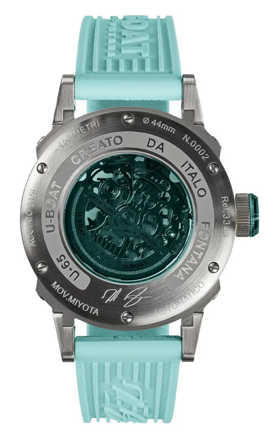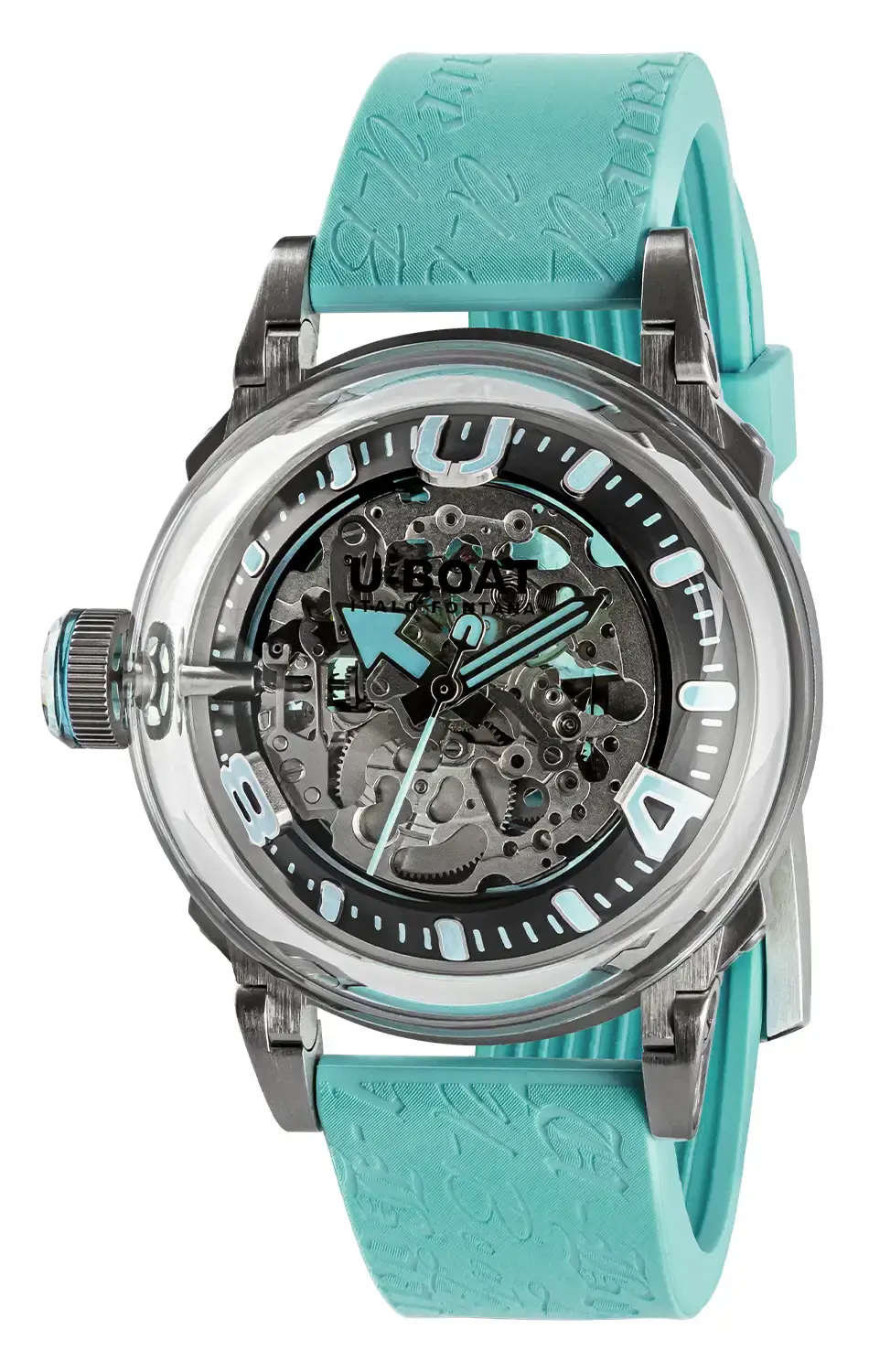 V tyrkysové variantě U-BOAT 3345 hodinky zaujmou precizním zpracováním a industriálním vzhledem, zatímco charakteristické pohyblivé nožky pouzdra – patent značky – zajišťují perfektní usazení na zápěstí i přes výrazný průměr 44 mm. Tyrkysová minerální vložka v korunce ladí s odstínem luminiscence i s průhledným dýnkem, skrz které lze sledovat personalizovaný rotor během jeho práce. Vzniká kompaktní vizuální kompozice, v níž se barva, světlo a pohyb propojují do jediného příběhu o čase zachyceném v pulzujícím mechanismu. Vodotěsnost do přibližně 50 metrů a silikonový řemínek v tyrkysovém odstínu s výrazným reliéfem zajišťují pohodlné nošení a podtrhují ikonický styl U-BOAT.