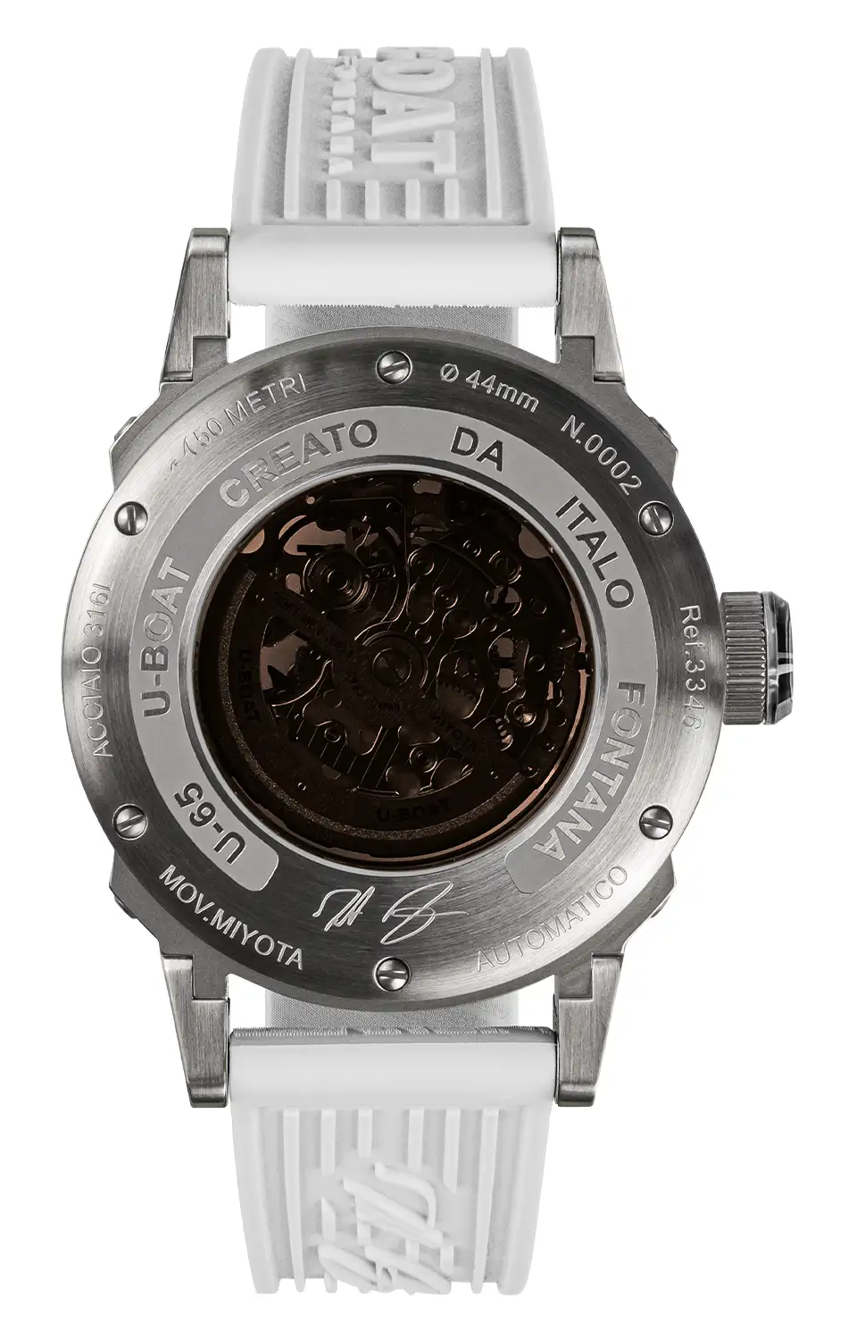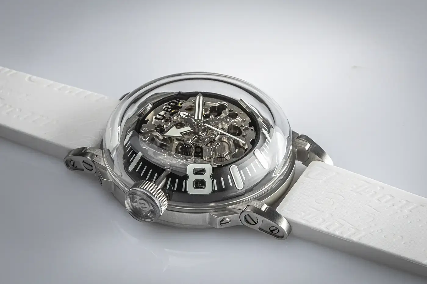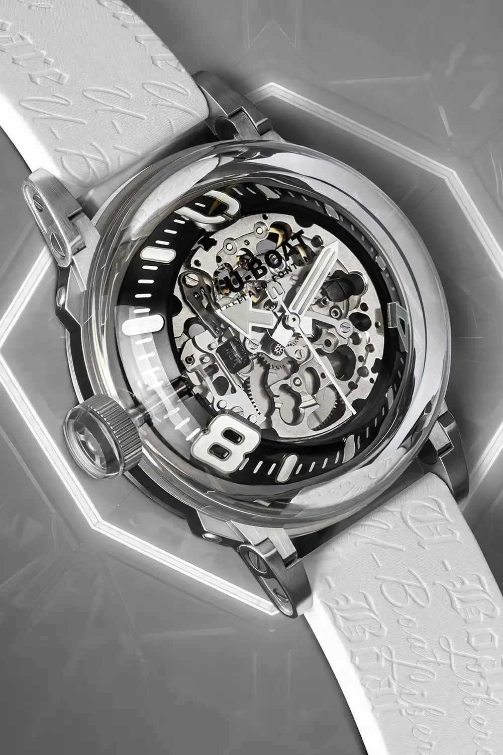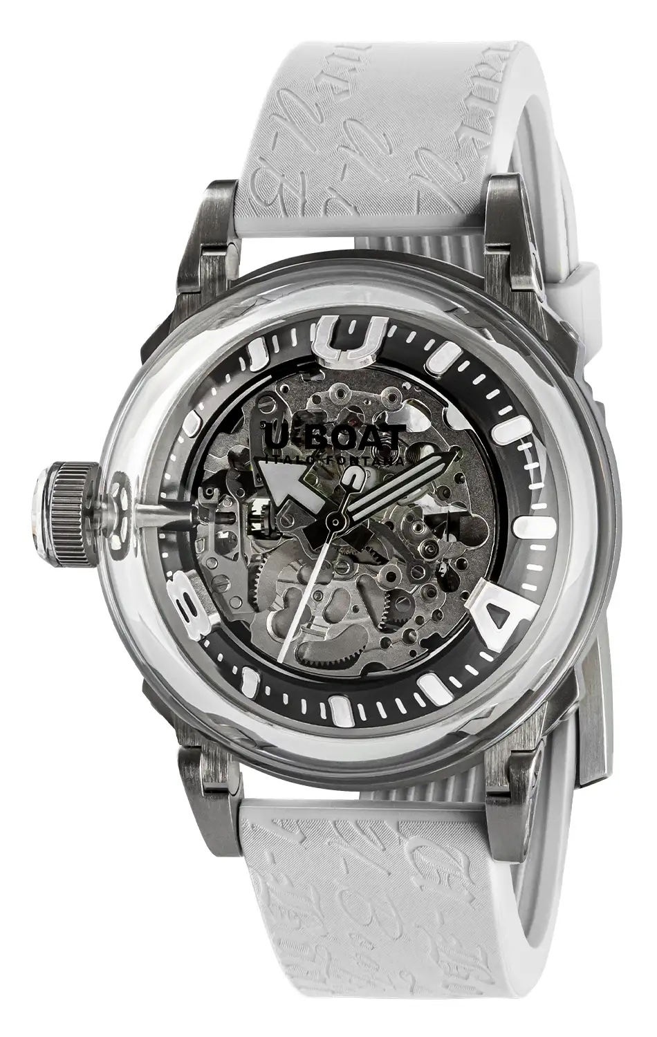 V bílé variantě U-BOAT 3346 vynikají hodinky precizním zpracováním a industriálním charakterem, zatímco charakteristické pohyblivé nožky pouzdra – patent značky – zajišťují ideální usazení na zápěstí i přes působivý průměr pouzdra 44 mm. Skleněná vložka v korunce ladí s odstínem luminiscence a s lehce zatmaveným průhledným dýnkem, skrz které lze sledovat personalizovaný rotor během chodu strojku. Výsledkem je harmonická kompozice, v níž se barva, světlo a pohyb spojují do jednoho příběhu o čase zachyceném v pulzujícím kalibru. Vodotěsnost do přibližně 50 metrů a silikonový řemínek v bílém odstínu s charakteristickým reliéfem zajišťují komfort každodenního nošení a podtrhují rozpoznatelný styl U-BOAT.