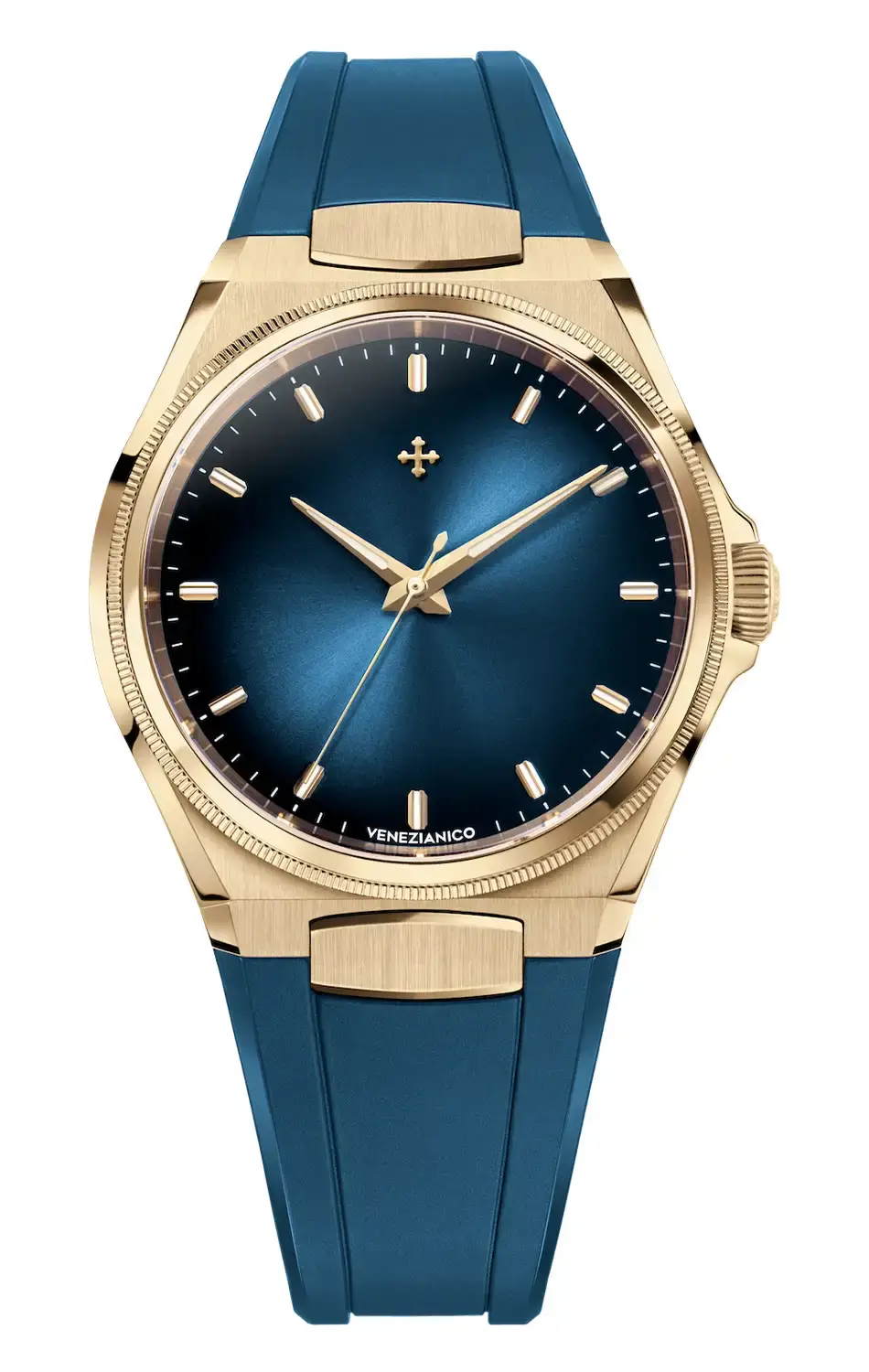 Symbolika hodinek Venezianico 6221556 odkazuje na Koně sv. Marka – majestátní sochy, které jsou po staletí ikonou moci a hrdosti Benátek. Jejich vyobrazení zdobí gravírované víko z ušlechtilé oceli, které vytváří výrazný kontrast s teplými tóny bronzu. Díky kombinaci pískované a radiálně saténové úpravy získávají postavy trojrozměrnost. Jemná hra světla navíc způsobuje, že dekorace ožívá z každého úhlu. Hodinky doplňuje integrovaný modrý pásek z voděodolné a snadno čistitelné gumy, který poskytuje komfort i dlouhou životnost. Venezianico Arsenale Bronzo je poctou benátskému dědictví a zároveň moderními hodinkami pro znalce, kteří oceňují jak umění, tak spolehlivou funkčnost.