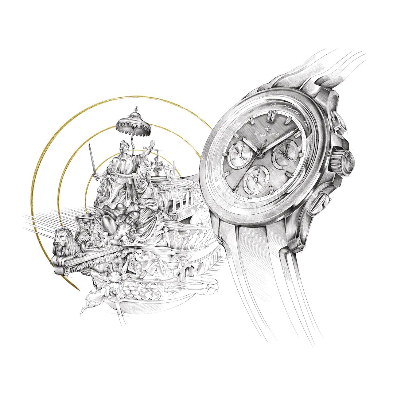 Hodinky Venezianico Bucintoro Tricompax 42 8221510 jsou elegantní chronograf s třemi chronografickými subciferníky a tachymetrem, inspirovaný historickou Bucintoro — galérou dóžecí republiky Benátky Serenissima (Doge's Galley), která byla používána během ceremonií, jako je zahájení Historických regat, prestižní sportovní akce s nejlepšími veslaři Benátek, dnes známé jako "Regata Storica" (Historické regaty). Tento závod dokonale spojuje ducha soutěže na vodě s elegancí benátské tradice.