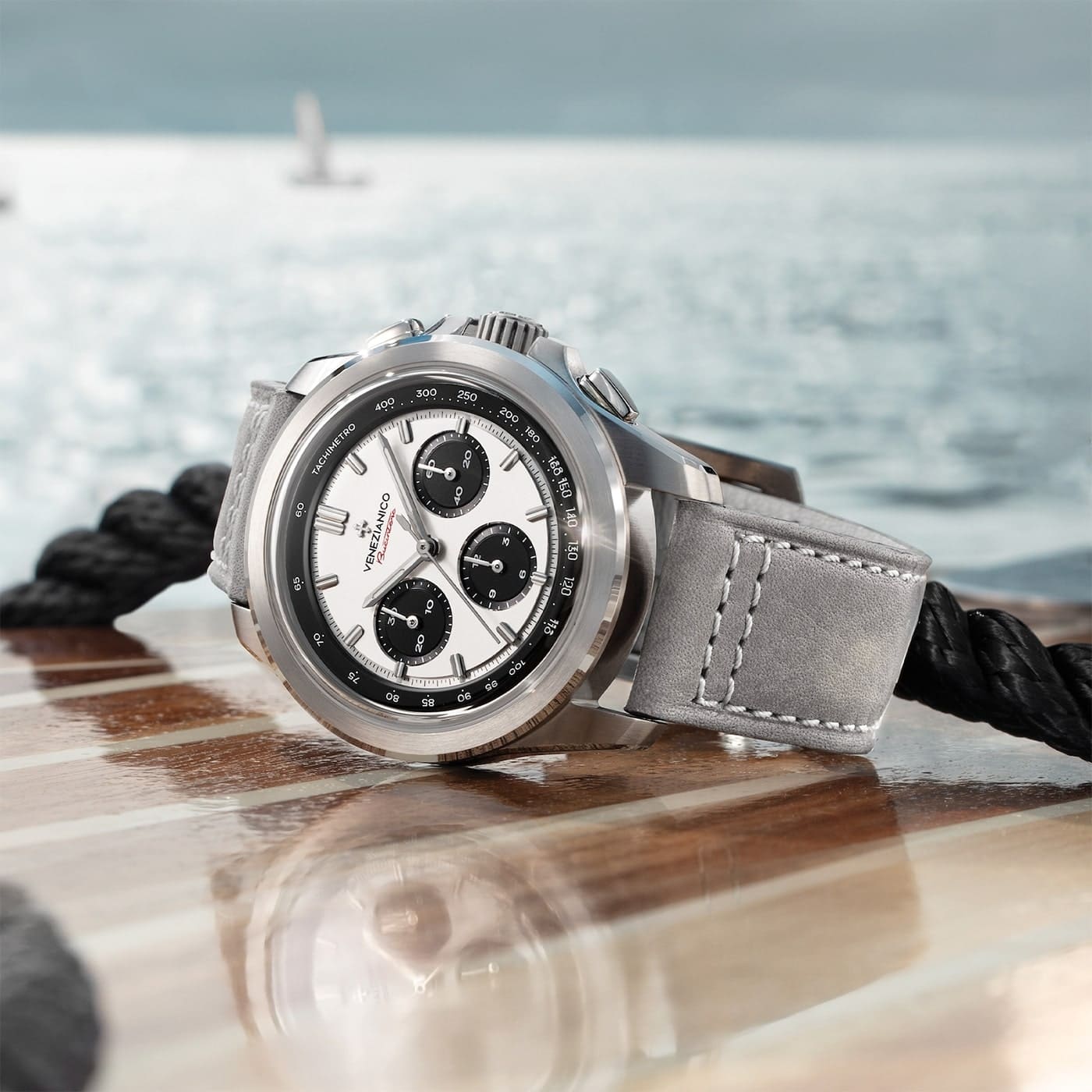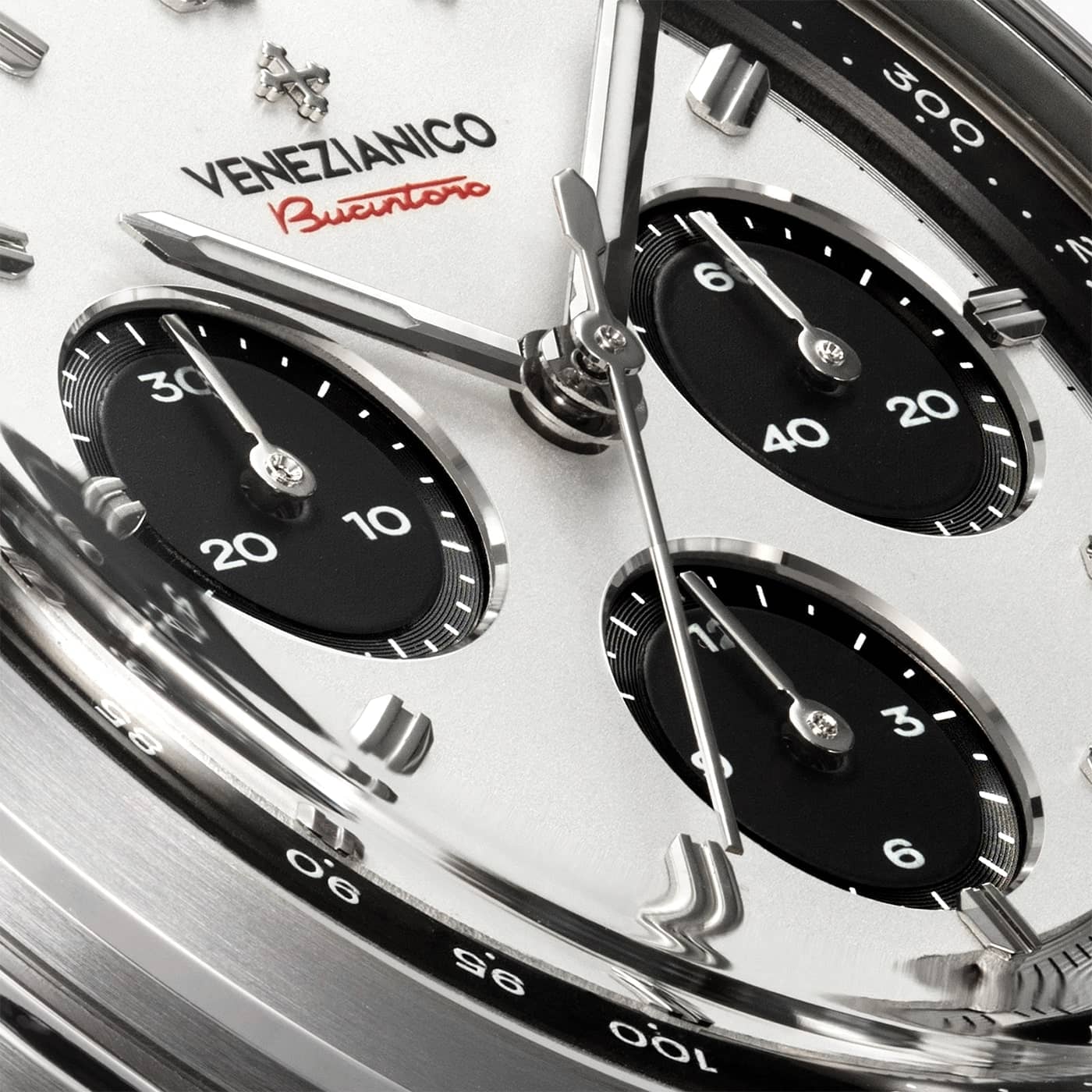 Venezianico Bucintoro Tricompax se vyznačuje štíhlým pouzdrem o tloušťce pouhých 11,70 mm, které v kombinaci s vyvýšeným safírovým sklem o tloušťce 1,90 mm, odolným proti poškrábání, zajišťuje vynikající přizpůsobení různým zápěstím. Průhlednost tohoto skla v kombinaci s podsvícením BGW9 Super-LumiNova® na indexech a ručkách představuje ideální řešení pro hodinky. Tento vyspělý luminescenční pigment, bílý za denního světla, po nabití vyzařuje intenzivní modro-zelené světlo, které zajišťuje dobrou viditelnost ve tmě. I přes svou impozantní technickou specifikaci zachovává Bucintoro všestranný a elegantní design. Pouzdro vyrobené z odolné nerezové oceli 316L a komfortní šedý kožený řemínek činí tyto automatické chronografy vynikající volbou na každou příležitost — jak na běžný den, tak na formální události.