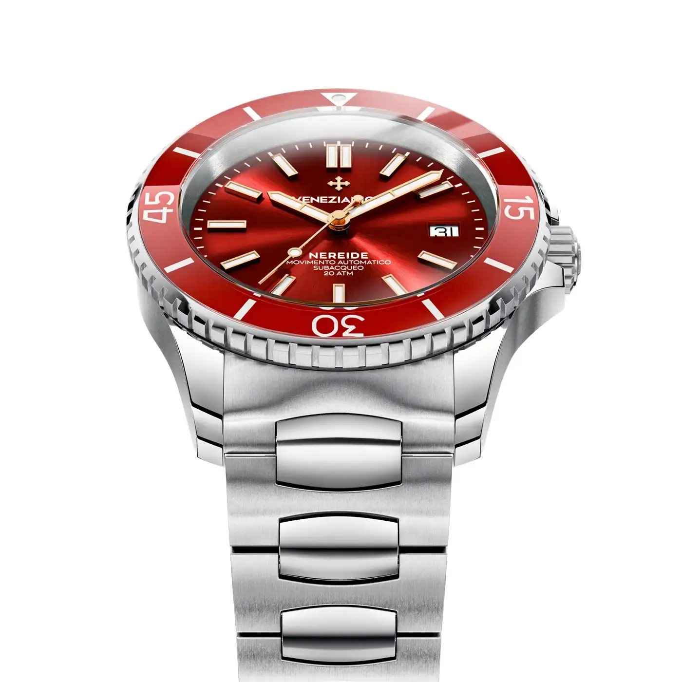 Výjimečný design těchto potápěčských hodinek zdůrazňuje náramek Canova, jehož jedinečná konstrukce vyžadovala až šestnáct různých výrobních forem. Kombinace lesklé a saténové povrchové úpravy vytváří harmonický a elegantní vzhled, zatímco jemně zvýrazněné středové články dodávají moderní charakter. Motýlová spona perfektně zapadá do celkového designu náramku a nenarušuje jeho plynulost, což potvrzuje důraz na detail a estetiku. Výrazný ciferník typu Sunray, zdobený přesnými rytinami, které paprskovitě odrážejí světlo, dodává pánským hodinkám s červeným ciferníkem Venezianico dynamický a luxusní vzhled. Díky luminiscenčnímu pigmentu BGW9 Super-LumiNova® jsou ručičky a indexy dokonale čitelné i ve tmě, kde vydávají intenzivní modrozelené světlo.