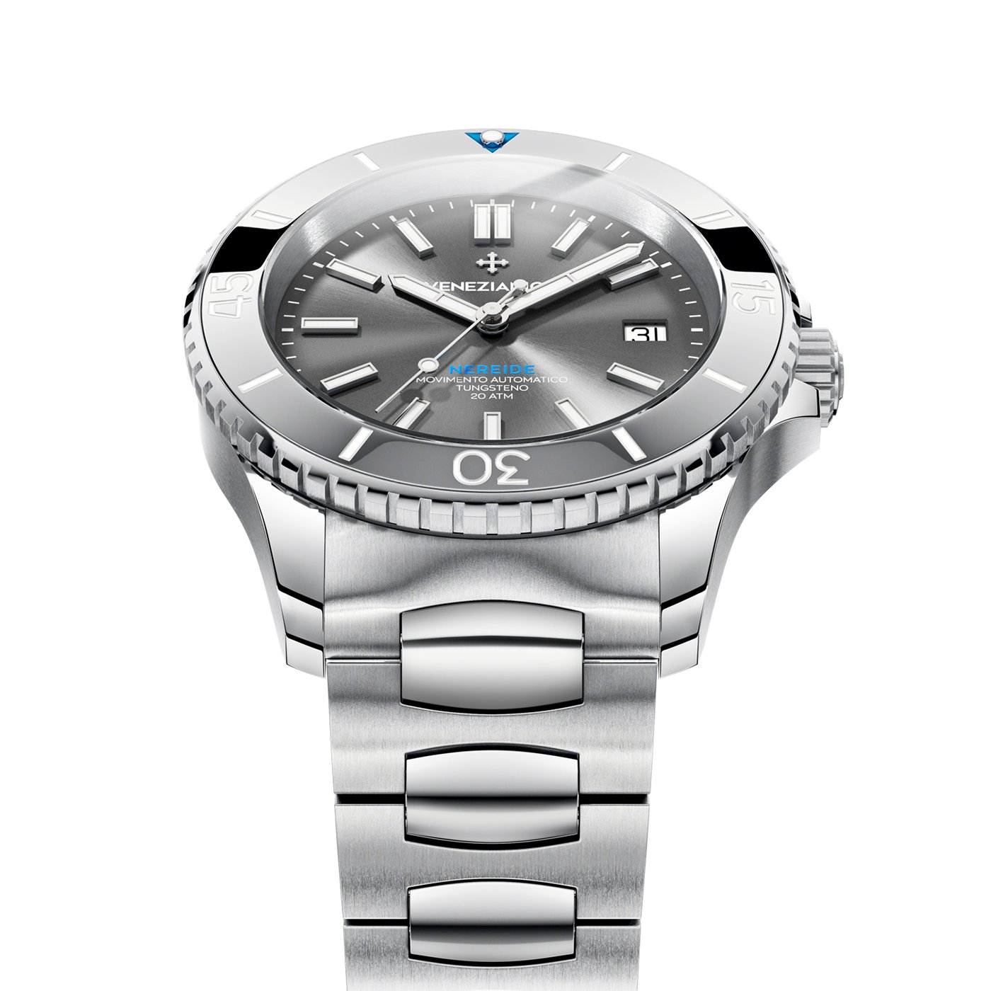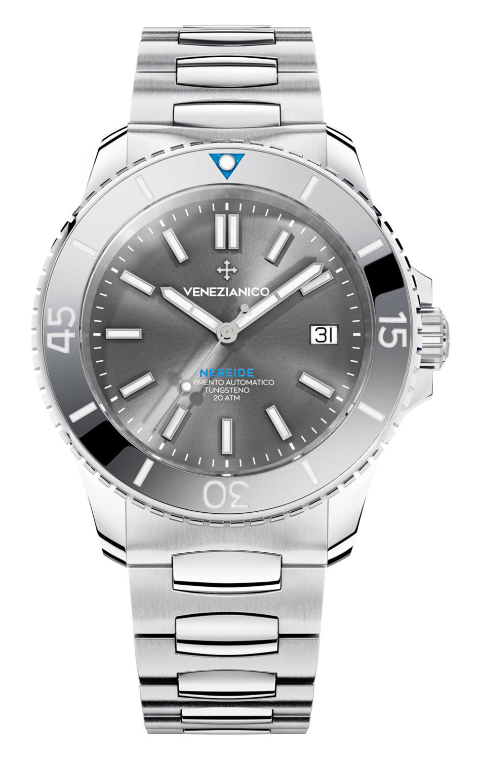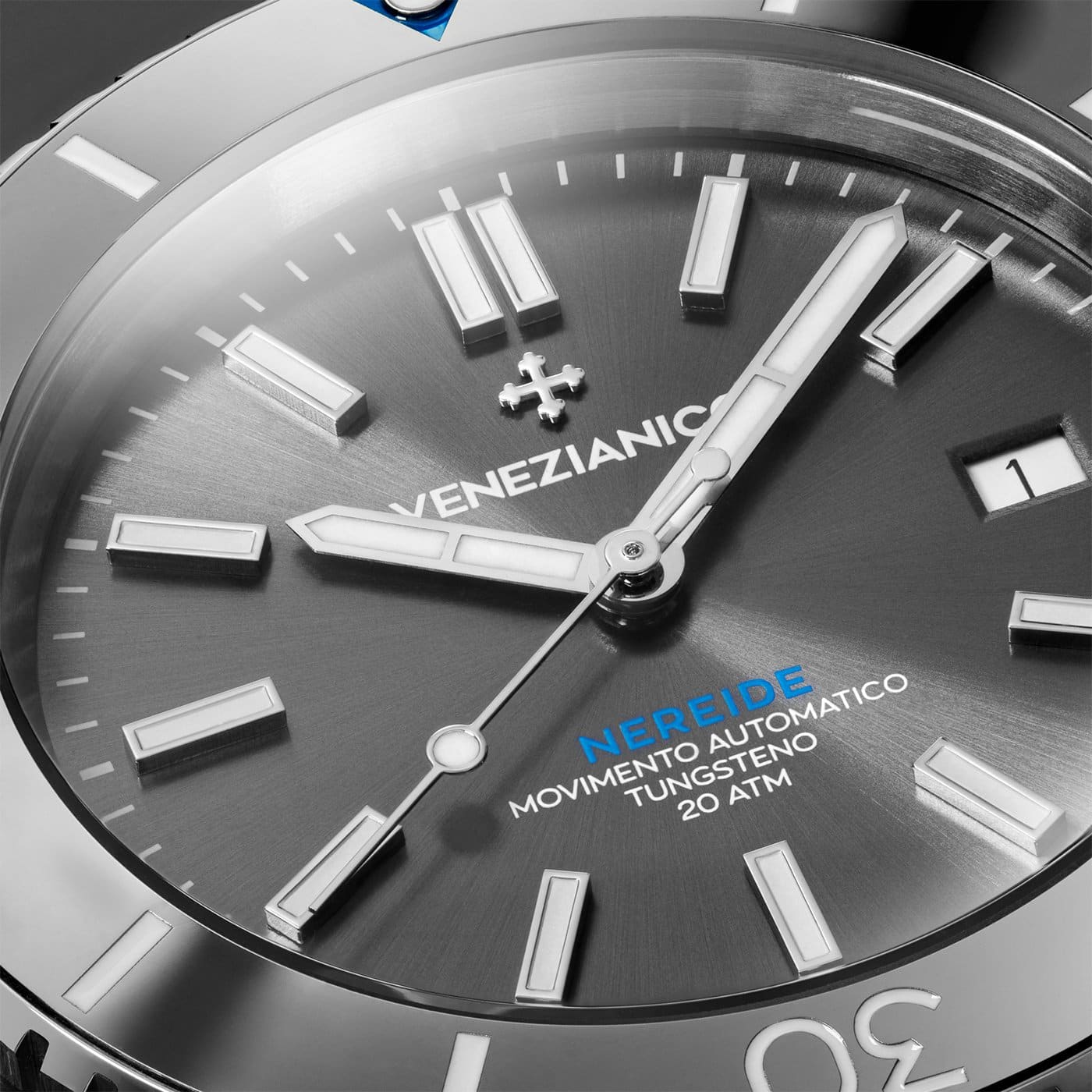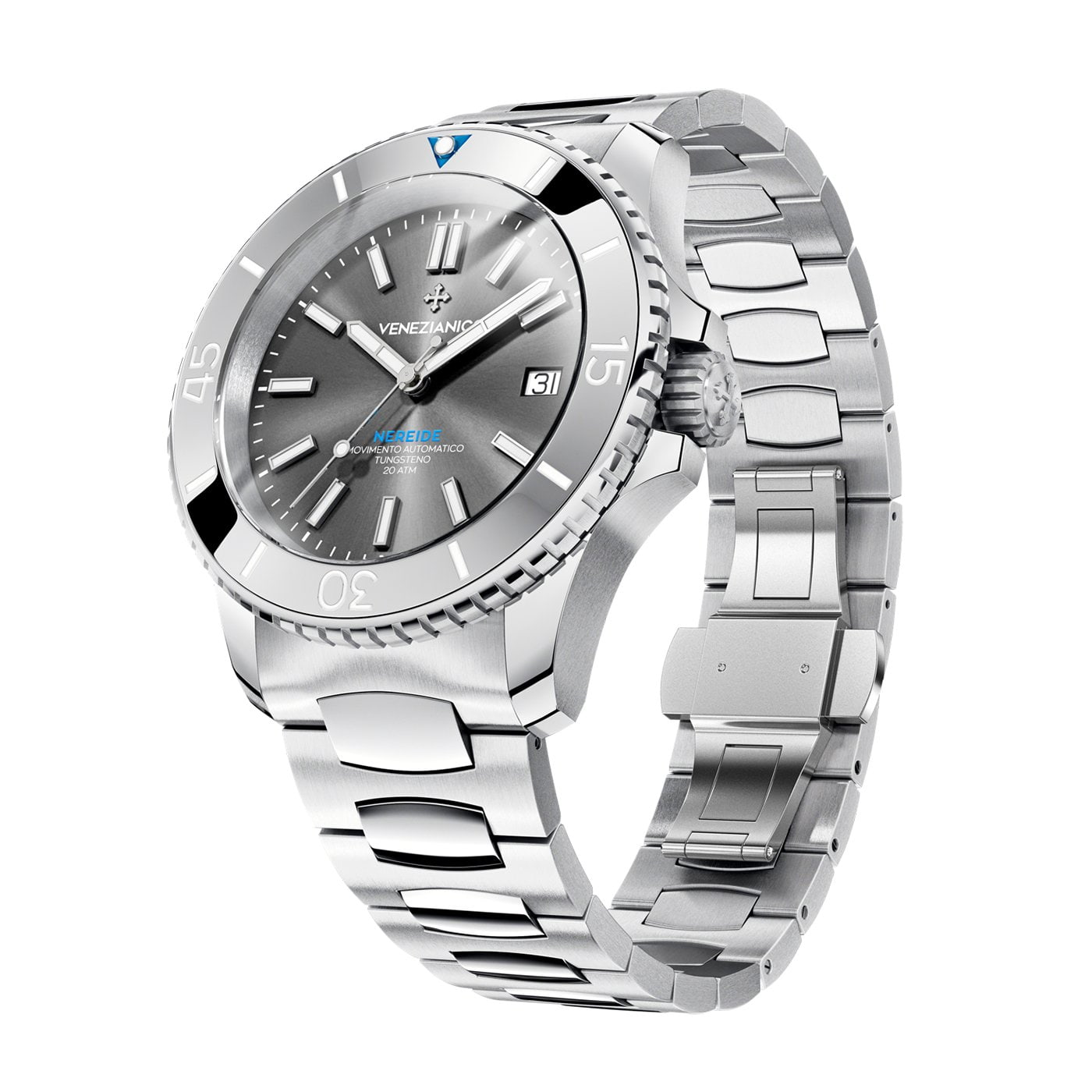 Pánské potápěčské hodinky Venezianico Nereide Tungsteno 4521502C byly vytvořeny s ohledem na extrémní podmínky, kombinující bezkonkurenční odolnost s elegantním italským designem. Jejich charakteristickým prvkem je luneta vyrobená z wolframu – nejtvrdšího kovu známého člověku, odolného proti poškrábání a opotřebení. Díky tomu si hodinky uchovávají svůj bezchybný vzhled po mnoho let, a to i při intenzivním používání. Ciferník modelu barevně ladí s lunetou, je proveden v elegantním grafitovém odstínu se slunečním brusem, který jemně odráží světlo a vytváří efekt hloubky a dynamiky. Jeho tlumený kovový lesk podtrhuje surovou, technickou estetiku hodinek, odkazující na odolnost a funkčnost modelu inspirovaného benátskou ponorkou Nereide. Celek činí z těchto hodinek perfektní volbu jak pro milovníky potápění, tak pro ty, kteří ocení stylovou sportovní eleganci.