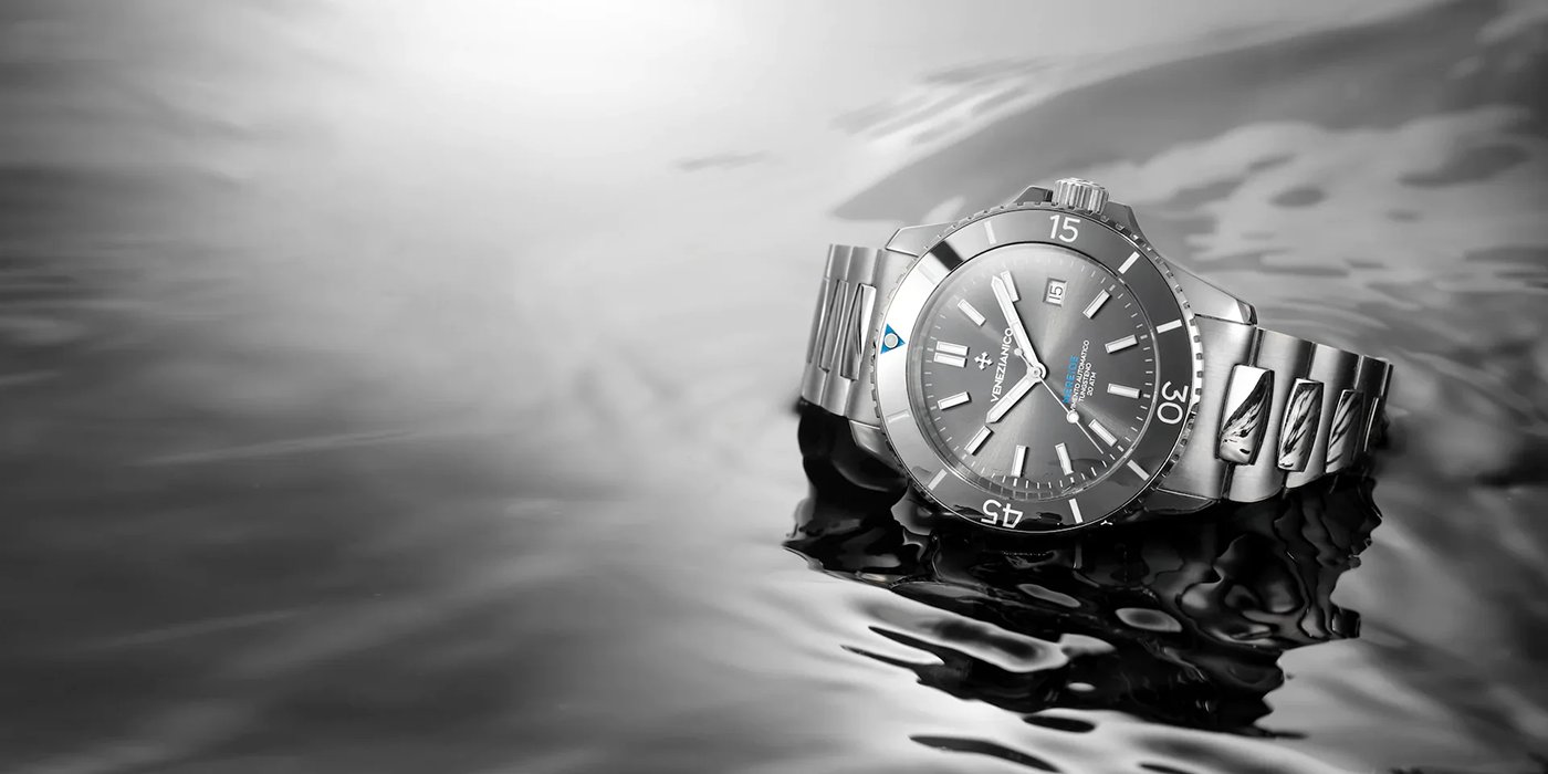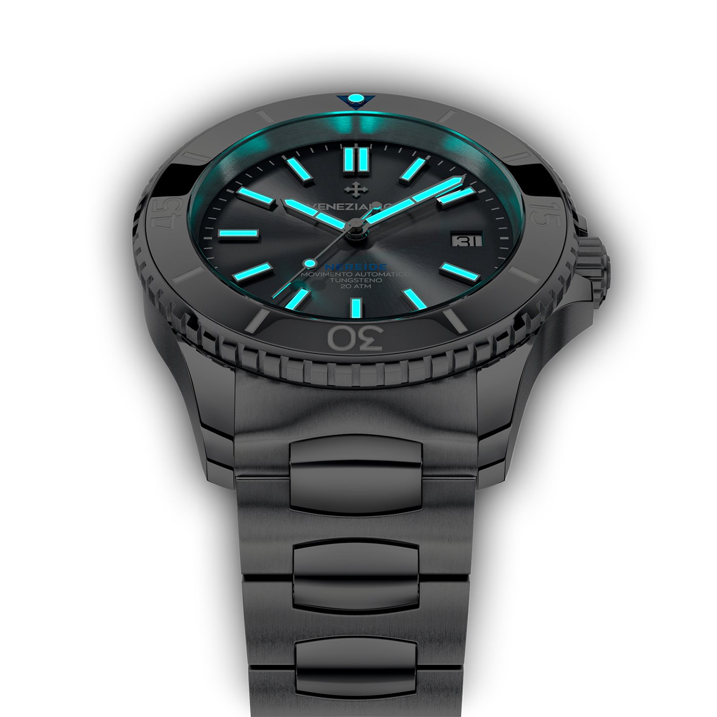 Funkčnost těchto elegantních pánských potápěčských hodinek podtrhuje exkluzivní náramek Canova s registrovaným designem. Jeho dvojité, lesklé a saténové provedení harmonizuje s pouzdrem, zatímco kontrastní centrální články dodávají eleganci. Motýlová spona se hladce integruje do konstrukce, čímž zajišťuje pohodlí a bezpečné přizpůsobení. Vynikající čitelnost za všech podmínek zajišťují indexy, ručičky a značení lunety potažené luminiscenčním pigmentem Swiss Super-LumiNova® BGW9, který po nabití denním světlem vyzařuje intenzivní modrozelenou záři, poskytující perfektní viditelnost i v hlubinách. Vodotěsnost na úrovni přibližně 20 ATM (200 metrů), podpořená šroubovací korunkou a třemi robustními těsněními, činí z hodinek Venezianico Tungsteno ideálního společníka pro podvodní dobrodružství, nabízejícího maximální bezpečnost a spolehlivost.