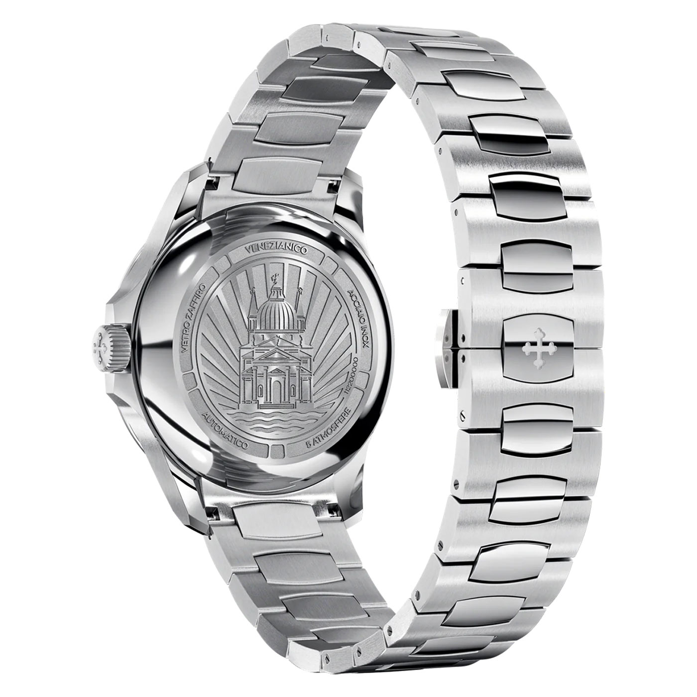 Venezianico Redentore 36 Diamond 1121520C je výjimečné hodinky, které vtělují klasickou eleganci a sofistikovanost, určené zejména pro ženy oceňující prestiž a nadčasový styl. Jejich srdcem je precizní automatický strojek Cal. Seiko NH35A, zaručující spolehlivost a dokonalou kvalitu zpracování. Ciferník z perleti, osazený 12 etickými diamanty pěstovanými v laboratoři, vyzařuje jemný luxus a zároveň představuje odpovědnou a udržitelnou volbu. Tyto kameny vznikají v kontrolovaných podmínkách, což minimalizuje dopad na životní prostředí a eliminuje riziko konfliktů charakteristických pro tradiční těžbu, díky čemuž každý detail hodinek spojuje krásu, modernost a vědomou eleganci. Nerezový náramek „Canova” s kombinovanou úpravou – lesklou a saténovou – dotváří celek a dodává tomuto modelu s diamanty jedinečný charakter.