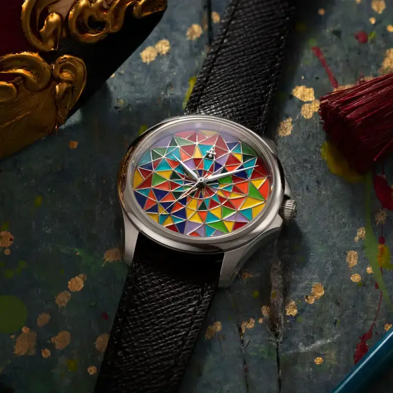 Klíčovým prvkem projektu je ruční smaltování za studena. Každý sektor ciferníku je vyplňován individuálně s důrazem na intenzitu a harmonii odstínů. Tento proces podtrhuje řemeslný charakter modelu Venezianico Carnival a činí z něj skutečně sběratelské hodinky. Leštěné stříbrné hrany oddělují jednotlivé barvy a dodávají ciferníku jasnou strukturu, čímž posilují efekt, který nabízí karnevalové hodinky se smaltovaným ciferníkem inspirovaným uměním. Kompozici doplňují dvoutónové ručky typu Alpha kombinující leštěné a pískované plochy, díky čemuž zůstávají dobře čitelné na pozadí vícebarevné mozaiky a jemně pracují se světlem. Celek je osazen ručně vyrobeným černým řemínkem z kůže Saffiano, jehož elegantní textura podtrhuje italský charakter projektu a vyvažuje uměleckou expresi ciferníku.