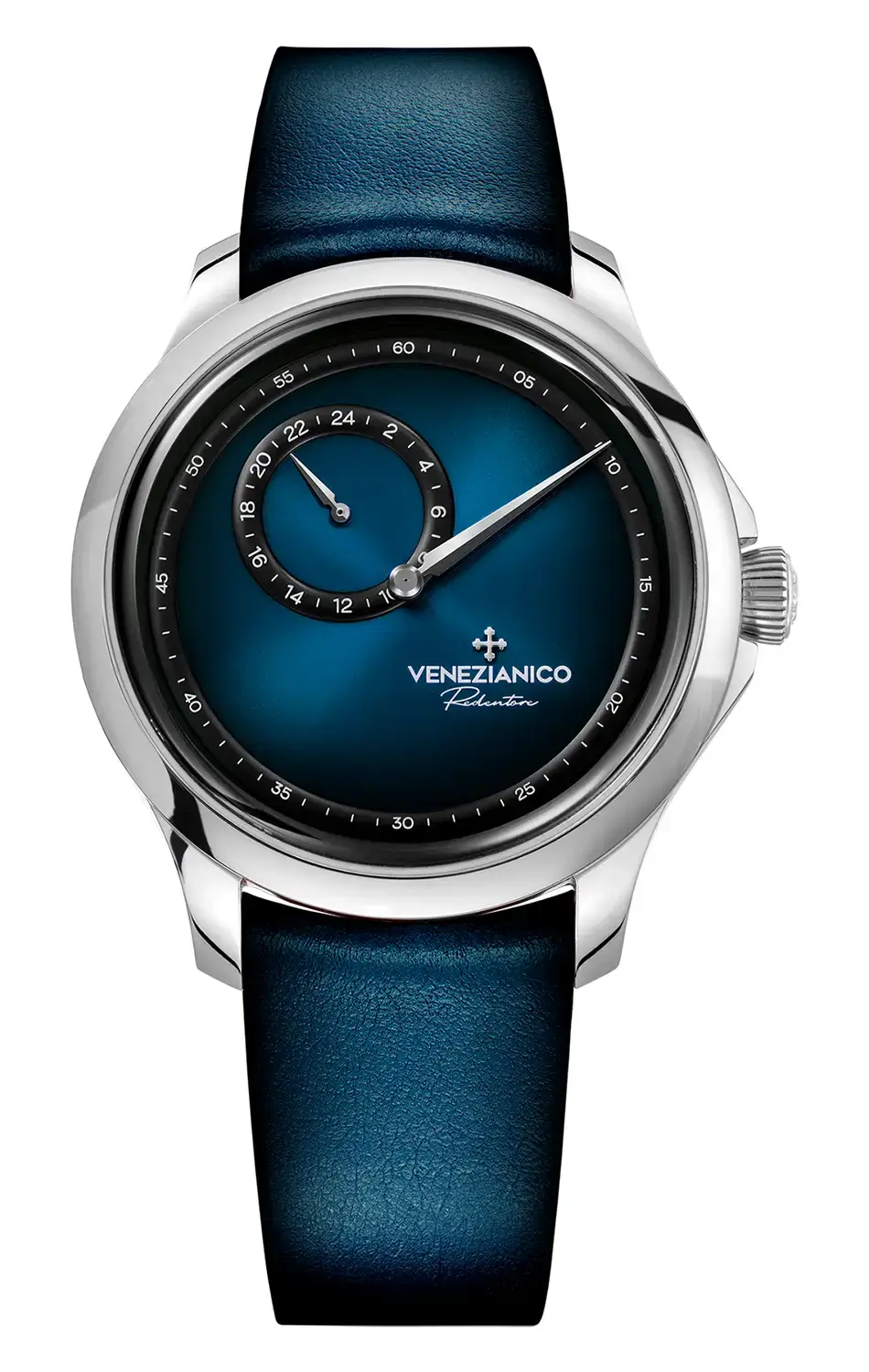 Venezianico Redentore Enigma 1221571 je výjimečný, tajemný model, který spojuje inovativní přístup k zobrazování času s klasickým, minimalistickým designem. Jeho hlavní charakteristikou je mosazný číselník v konfiguraci Regulator, inspirovaný 18. stoletím, kde jsou hodiny a minuty prezentovány v samostatných sektorech, což poskytuje jasnější čtení a nezaměnitelný estetický prvek. Centrální ručička ukazuje minuty, zatímco sub-číselník zobrazuje 24hodinový čas. Absence indexů na modrém číselníku s elegantní úpravou soleil a fumé vytváří harmonickou, čistou kompozici, která přitahuje pozornost svým purismem a výjimečným charakterem. Elegantní ručičky typu dauphine, namontované na dvou samostatných, kopulovitých kroužcích, dodávají hodinkám vytříbený neoklasicistní styl, který respektuje tradici.