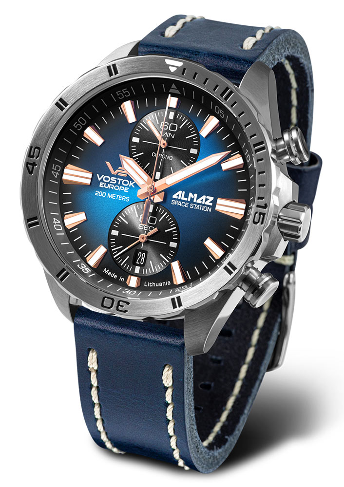 Spolehlivý japonský quartzový strojek Miyota 6S11 zajišťuje centrální chronograf, minutku chronografu, datumovku a funkci rychlého resetu, což zaručuje přesný chod za všech okolností. Hloubkově zapuštěný, gradientní ciferník se dvěma čítači a jednosměrná otočná luneta s tvrzeným minerálním sklem K1 s antireflexní vrstvou zajišťují vynikající čitelnost a trvanlivost. Titanové hodinky z kolekce Almaz značky Vostok Europe jsou navíc vybaveny pozlacenými mečovými ručkami a indexy naplněnými luminiscenční látkou, což zajišťuje vynikající viditelnost v podmínkách nízkého osvětlení. Na šroubovacím dýnku, vodotěsném do 200 metrů, je vygravírované číslo limitace 0000/3000. To nejsou jen hodinky, ale skutečná sběratelská lahůdka pro milovníky vesmíru a špičkové technologie.