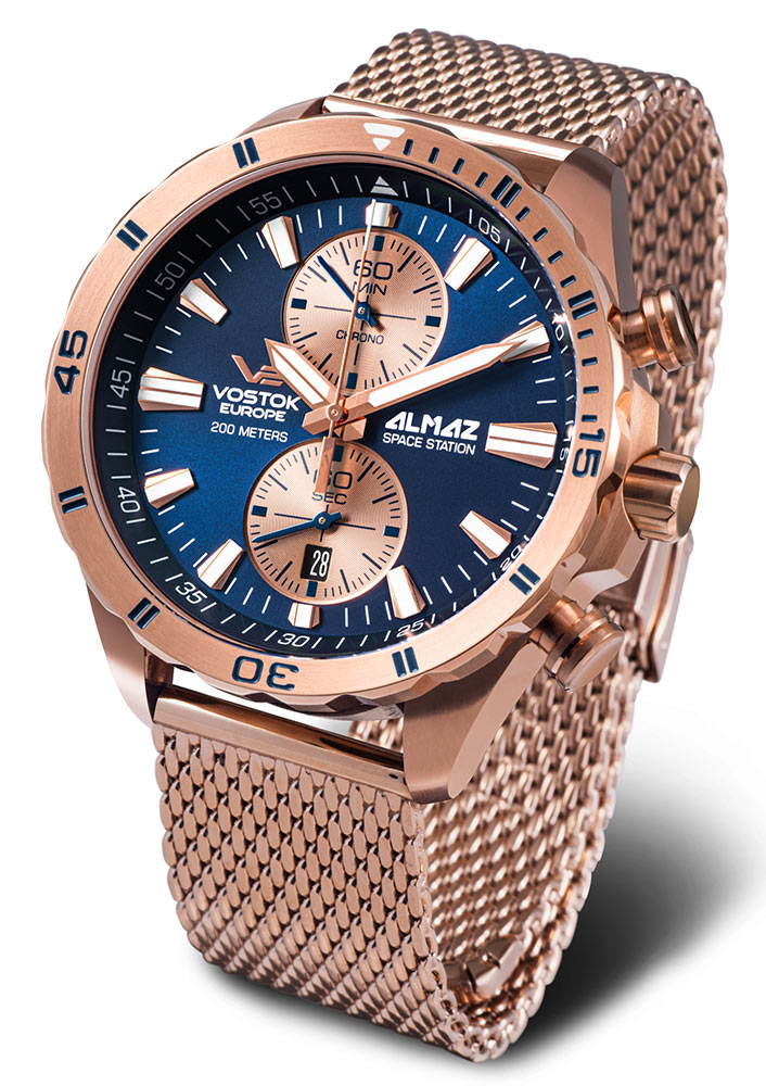 Navržené s ohledem na odvážné, pánské hodinky Vostok Europe Almaz Space Station na růžově zlatém mesh náramku spojují eleganci s mimořádnou funkčností. Solidní ocelové pouzdro o působivém průměru 47 mm a tloušťce 15,40 mm je odolné vůči korozi a poškrábání. Jak pouzdro, tak ergonomický a elegantní milánský náramek jsou potaženy PVD vrstvou v růžově zlaté barvě, což hodinky zvláště vyniká v kombinaci s modrým ciferníkem se zlatými subciferníky. Vysoce kvalitní materiály a trvanlivý povlak činí tento elegantní chronograf ideální volbou pro každodenní nošení i pro extrémní dobrodružství na čerstvém vzduchu.