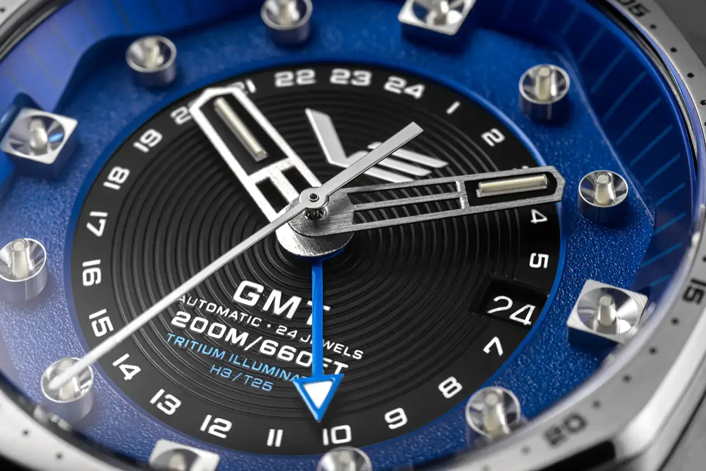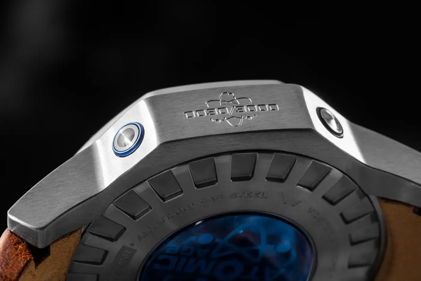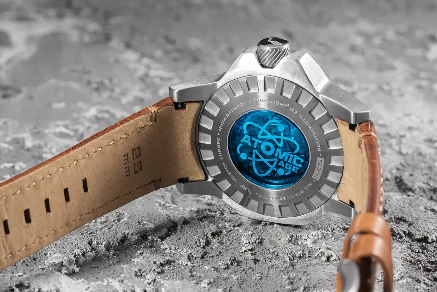 Hodinky GMT mají jedinečný číselník se zrnitou texturou v intenzivním odstínu modré, doplněný leštěnými kovovými indexy a svisle osazenými tritiovými trubicemi. Tritiová technologie podsvícení ze Švýcarska zajišťuje nepřetržitou viditelnost ve tmě po dobu nejméně 10 let bez nutnosti předchozího nabíjení světlem. Pečlivě kartáčované a skeletonizované ručičky dodávají těmto tritiovým hodinkám moderní technický vzhled, zatímco přišroubovaný zadní kryt s barevným sklem K1 a logem „Atomic Age Collection“ odkazuje na inspiraci jadernou vědou. Díky vodotěsnosti 200 metrů (20 barů) je model Atomic Age Fermi ideální nejen na souši, ale i v náročných vodních podmínkách.