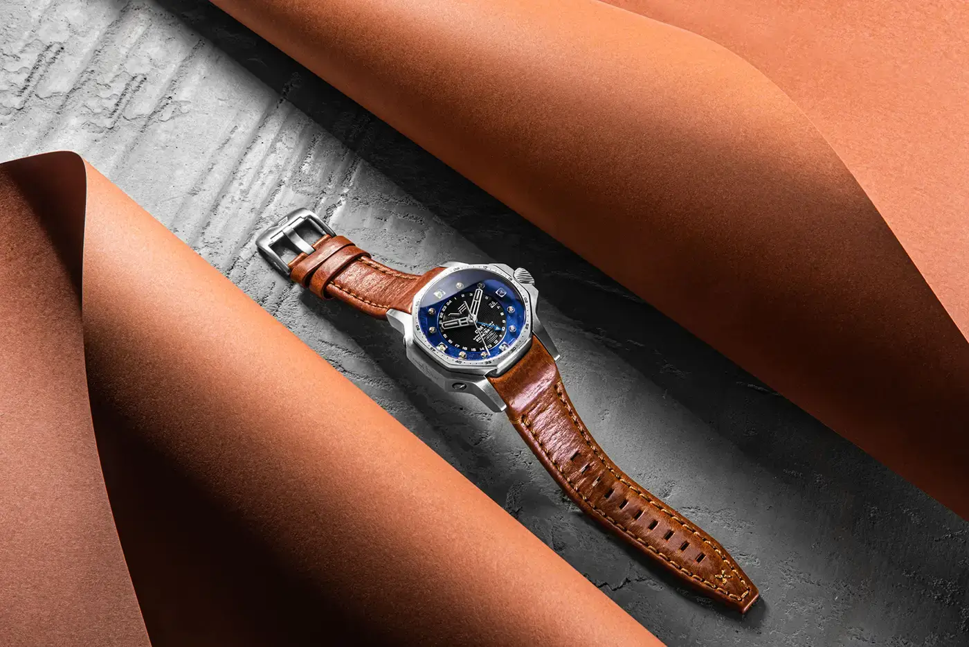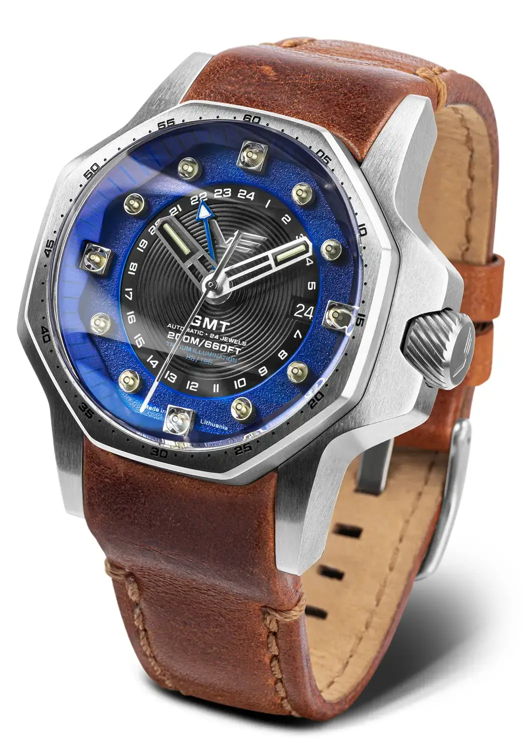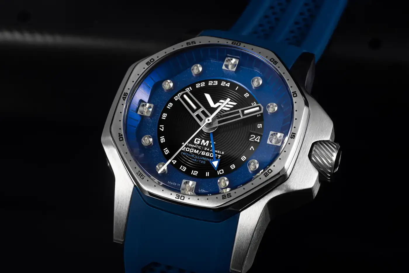 Hodinky GMT mají jedinečný číselník se zrnitou texturou v intenzivním odstínu modré, doplněný leštěnými kovovými indexy a svisle osazenými tritiovými trubicemi. Tritiová technologie podsvícení ze Švýcarska zajišťuje nepřetržitou viditelnost ve tmě po dobu nejméně 10 let bez nutnosti předchozího nabíjení světlem. Pečlivě kartáčované a skeletonizované ručičky dodávají těmto tritiovým hodinkám moderní technický vzhled, zatímco přišroubovaný zadní kryt s barevným sklem K1 a logem „Atomic Age Collection“ odkazuje na inspiraci jadernou vědou. Díky vodotěsnosti 200 metrů (20 barů) je model Atomic Age Fermi ideální nejen na souši, ale i v náročných vodních podmínkách.