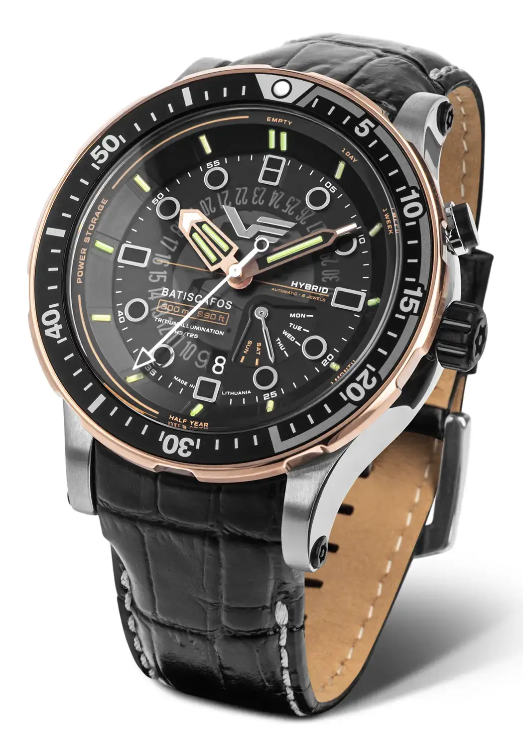Limitované pánské hodinky Vostok Europe Batiscafos Hybrid PX84-511E769 inspirované konstrukcí batyskafů, odkazují na hlubinný průzkum a inženýrství nejvyšší úrovně. Kolekce Batiscafos Hybrid vděčí za svůj název řeckým slovům „bathys“ (hluboký) a „skaphos“ (loď), což je pocta legendárním strojům, jako je Trieste – batyskaf, který jako první dosáhl dna Mariánského příkopu. Stejně jako tyto konstrukce i potápěčské hodinky Vostok Europe Batiscafos imponují robustností, odvahou designu a připraveností na extrémní podmínky.