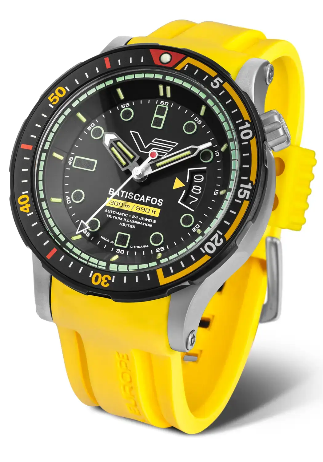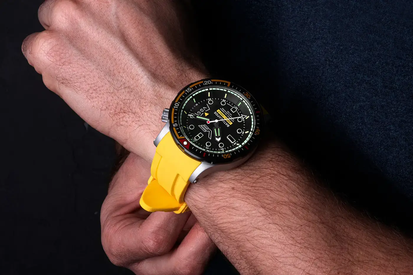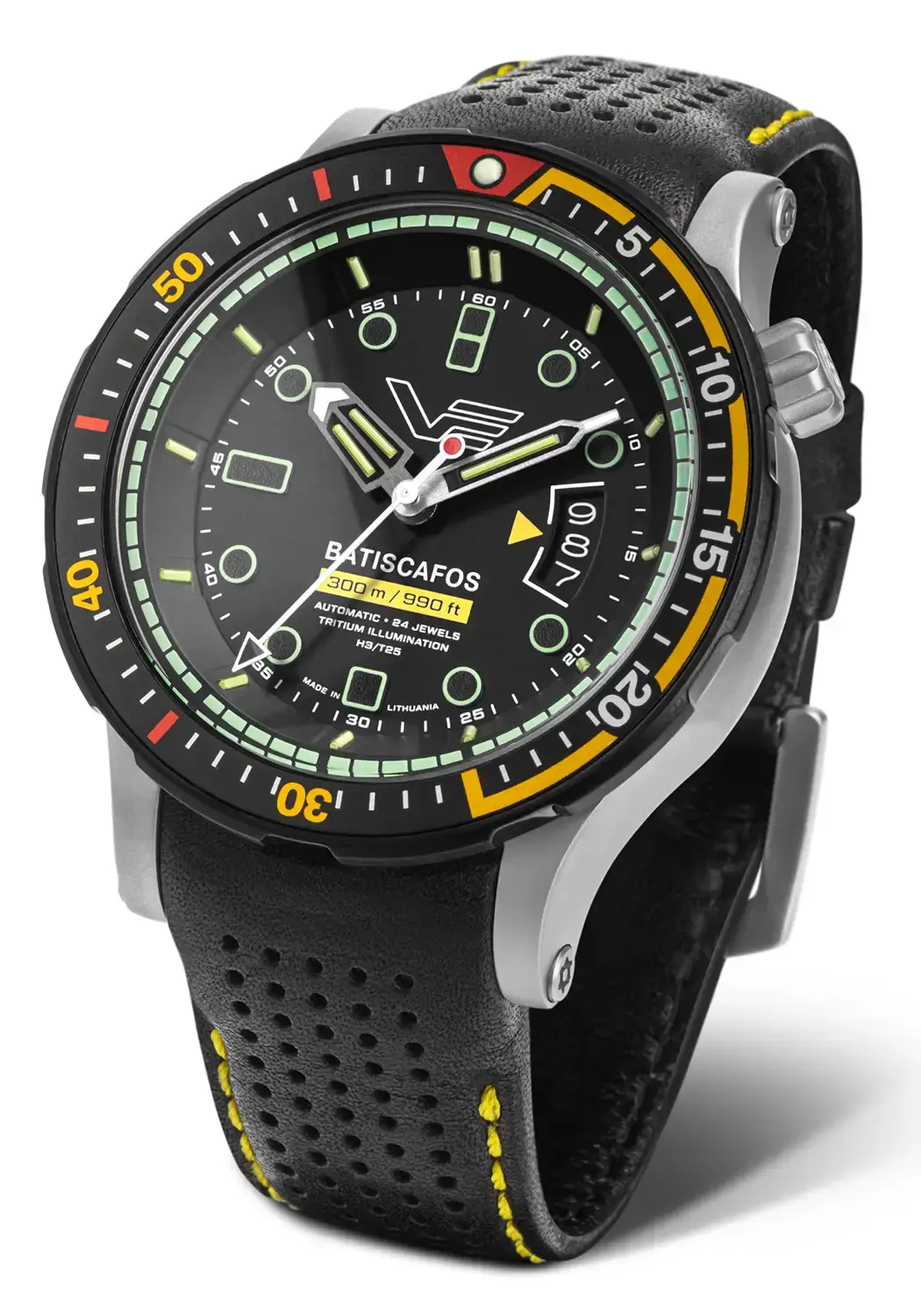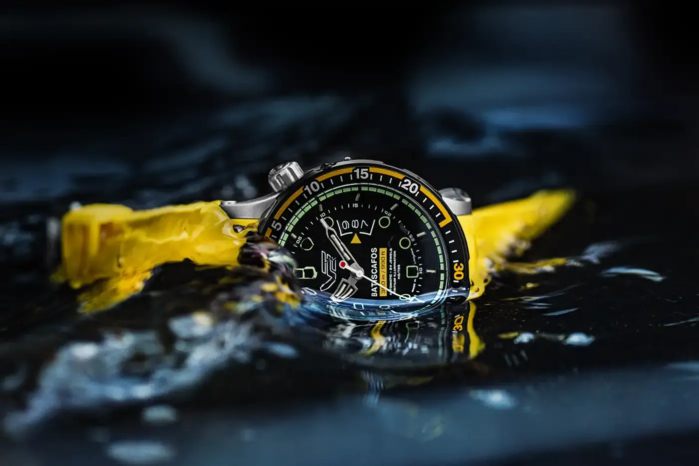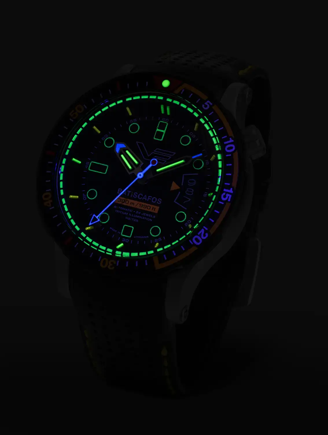 Číselník těchto automatických hodinek chrání odolné sklíčko K1 s antireflexní vrstvou, které zajišťuje maximální čitelnost i v extrémních podmínkách. Hluboce uložený černý ciferník s broušeným povrchem je obohacen o švýcarské tritiové trubice H3 a vrstvu Super-LumiNova – tato kombinace zaručuje vynikající viditelnost po mnoho let bez nutnosti dobíjení světlem. Hodinky Batiscafos nabízejí funkce hodin, minut, sekund a inovativní vějířový datovník umístěný v dolní pravé části ciferníku – zobrazující současně tři dny, přičemž aktuální datum je označeno žlutým trojúhelníkem. V balení se nacházejí dva vyměnitelné řemínky: žlutý silikonový se sportovním profilem a černý perforovaný kožený řemínek se žlutým prošíváním – oba snadno vyměnitelné podle příležitosti.