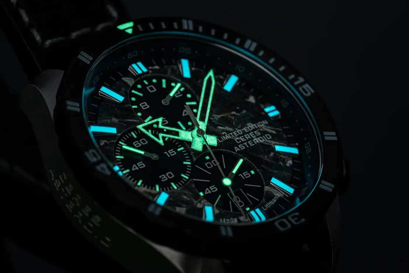 Vícevrstvý číselník hodinky Vostok Europe Ceres Asteroid, vyrobený z přírodního mramoru Hermes Grey Stone, odráží surový a majestátní charakter této kosmické ikony. Mramorová struktura dodává hodinkám výjimečný vzhled, který doplňují precizně navržené subčíselníky a výrazné indexy a ručičky. Časové ukazatele jsou perfektně čitelné díky efektní luminiscenci – modré na indexech a zelené na ručičkách a čítačích. Tento model kombinuje výjimečnou estetiku s odkazem na mytologii – název Ceres pochází od římské bohyně zemědělství.