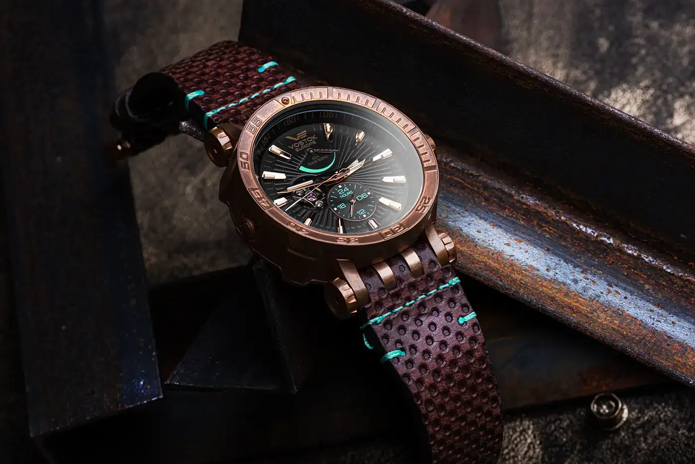 Automatický mechanismus Seiko Epson YN84, vyrobený v Japonsku, zaručuje spolehlivost a přesnost měření času. Na ciferníku, ručkách a lunetě jsou umístěny 15 trubic s tritiem vyrobenými ve Švýcarsku, což zajišťuje čitelnost v temnotě. Tyto limitované bronzové hodinky také nabízejí tři funkce viditelné na ciferníku - indikátor rezervy chodu, 24hodinový ukazatel a otevřený balancér.