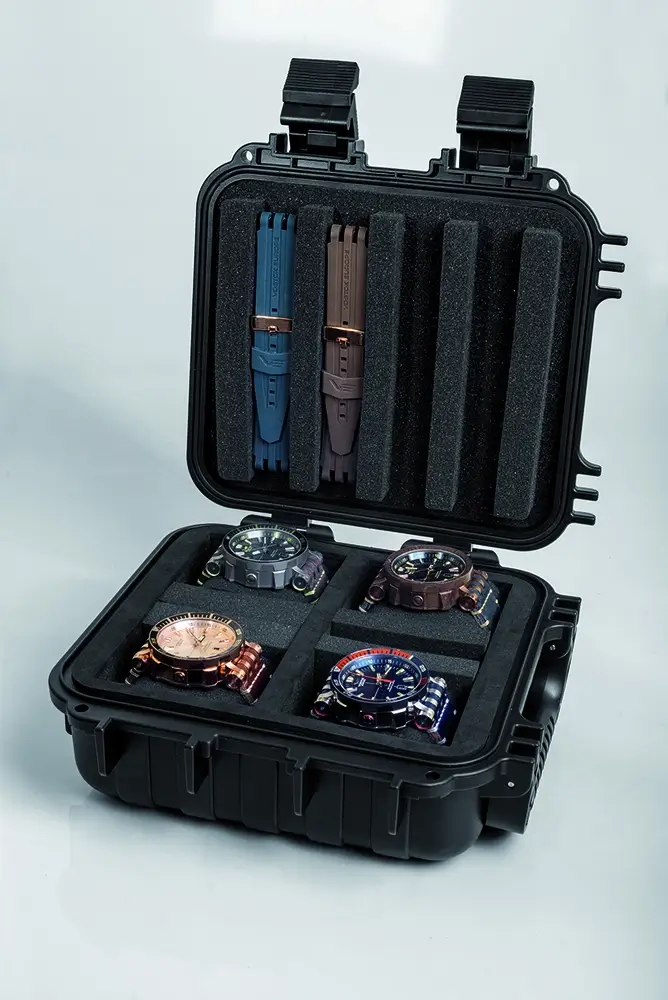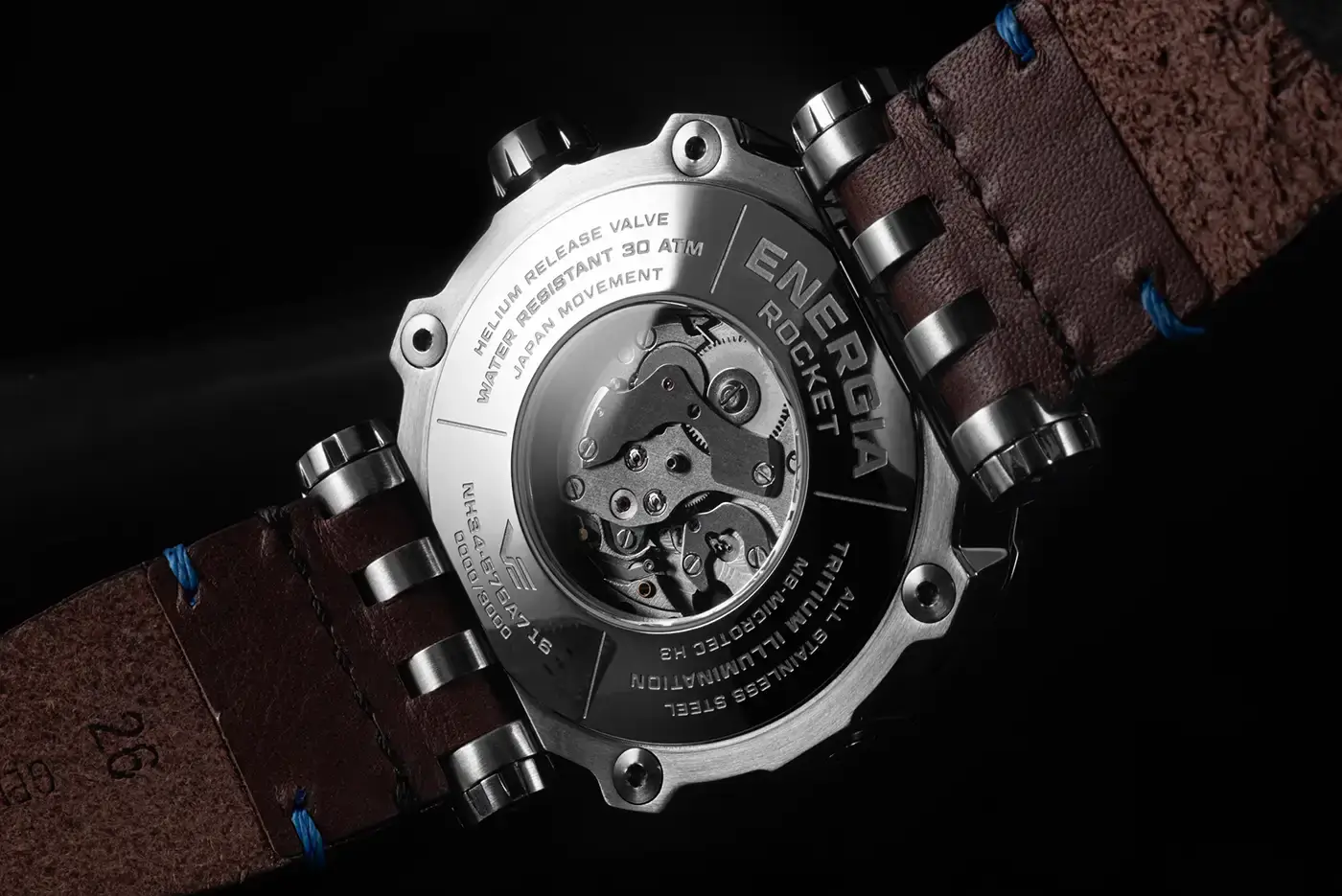 Tento velký hodinky z kolekce Energia Rocket se vyznačuje vodotěsností až 300 metrů / 30 ATM / 30 bar a impozantním průměrem 48 mm. Je vybaven přesným automatickým strojkem TMI NH34 a mnoha jedinečnými funkcemi, jako je heliový výpustný ventil, který se aktivuje při kritickém rozdílu tlaku, což je mimořádně užitečné pro potápěče. Navíc tyto potápěčské hodinky disponují 60minutovou lunetou otočnou jedním směrem. Hluboce usazený číselník chrání tvrzené minerální sklo K1 s antireflexní vrstvou o tloušťce 3,5 mm, které je odolné vůči poškrábání i nárazům. Na zadní straně robustního pouzdra z vysoce odolné nerezové oceli 316L se nachází šroubovací průhledné dýnko, které odhaluje japonský automatický strojek.